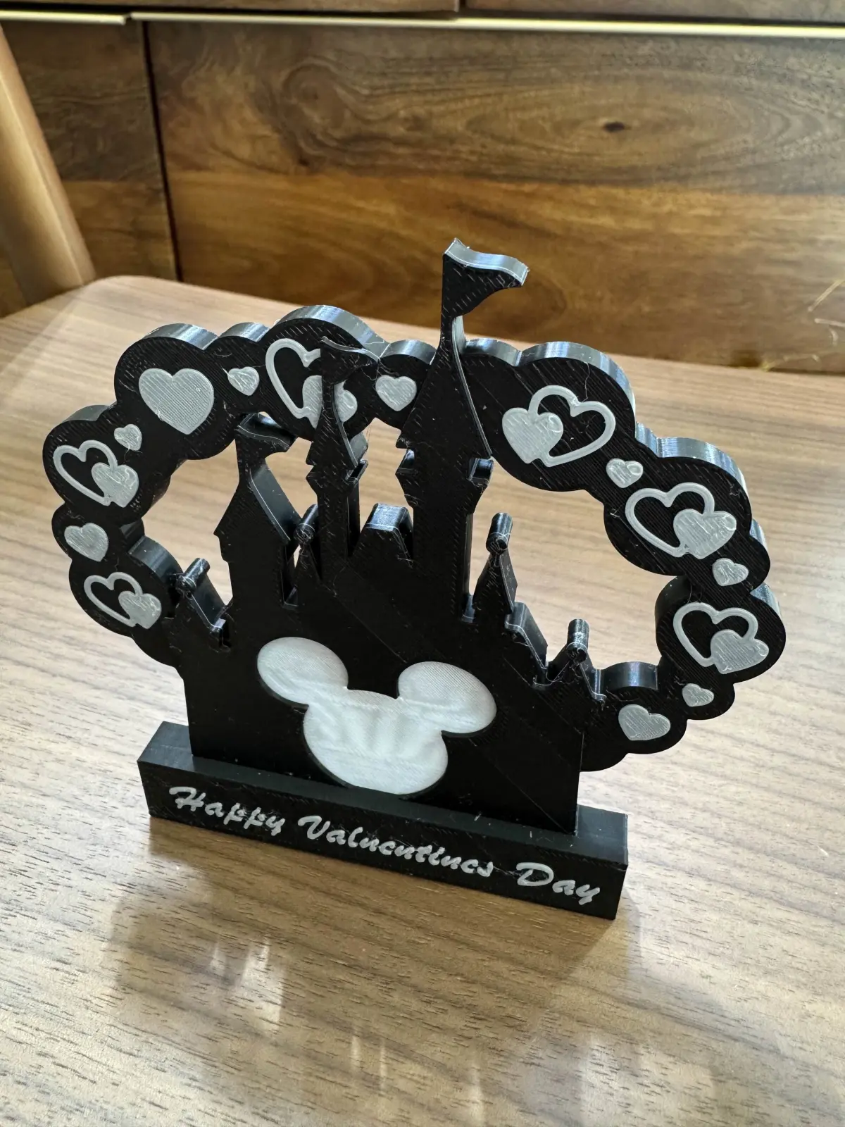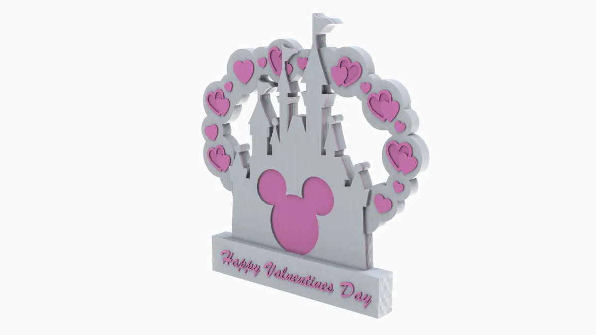 A Cute Mickey Mouse Valentines Day Decoration simple layers and prints fairly quickly. 2 tone so you can pick the color of the text and hearts, example 3D print shown in photos, prefered colors can be chosen