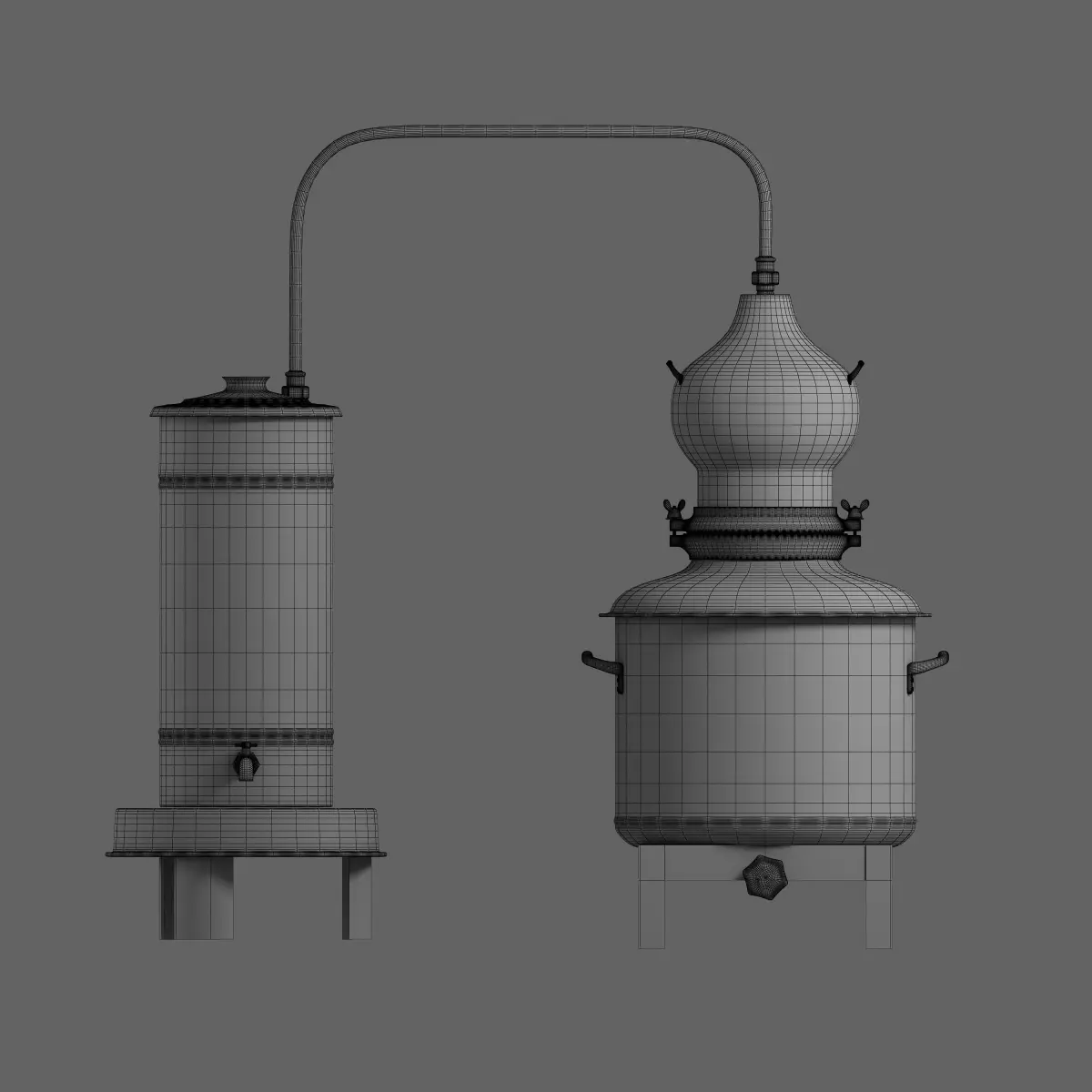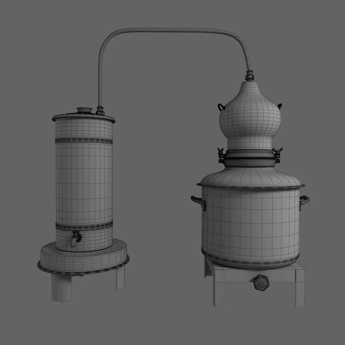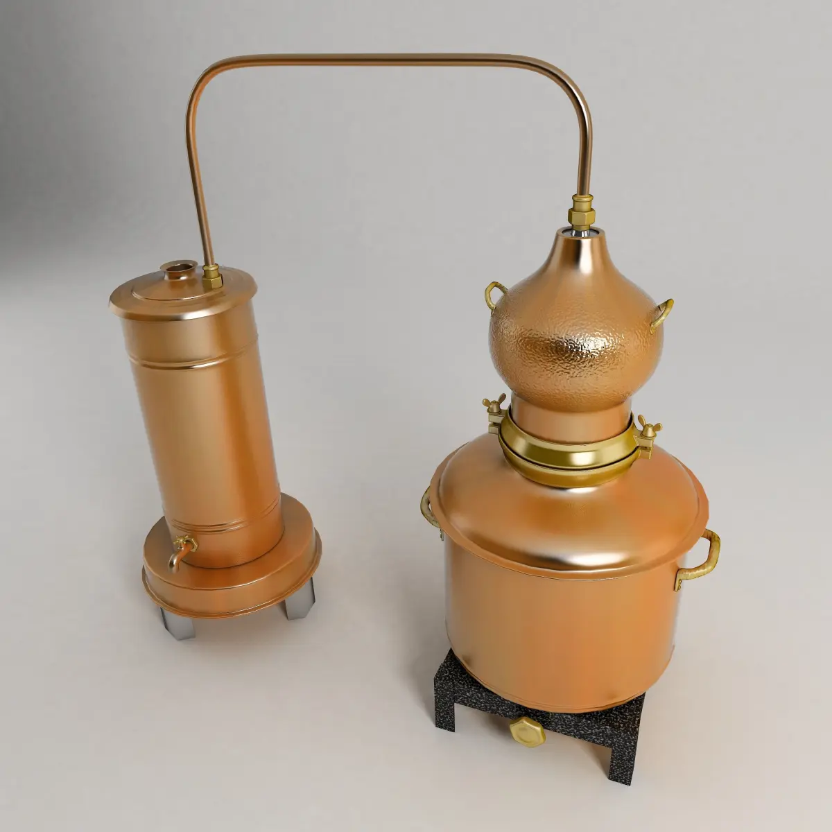 A traditional distiller equipment used to create alchohol spirits in small villages .The fire under the right boiler evaporates the liquid of grapes or potates and then the left tank cools to create a spirit with high amount of alchohol.