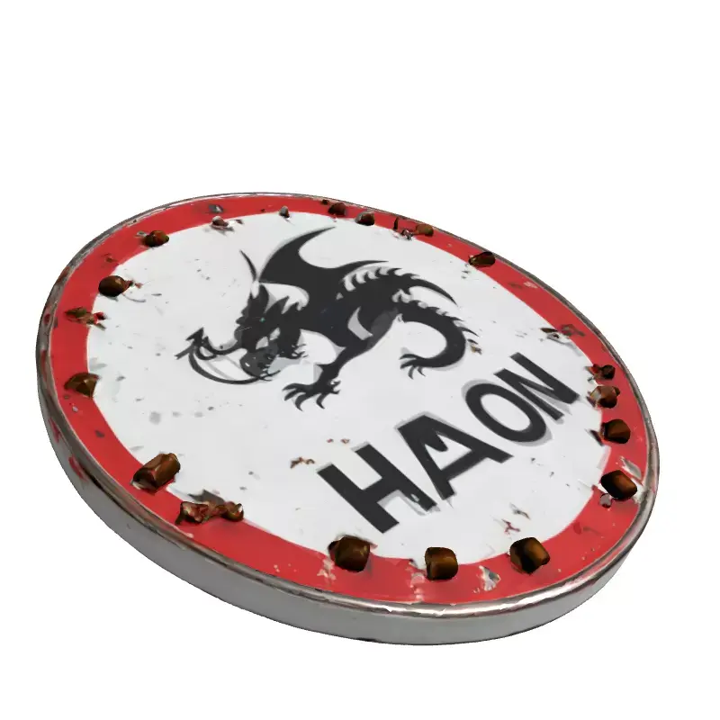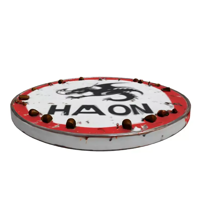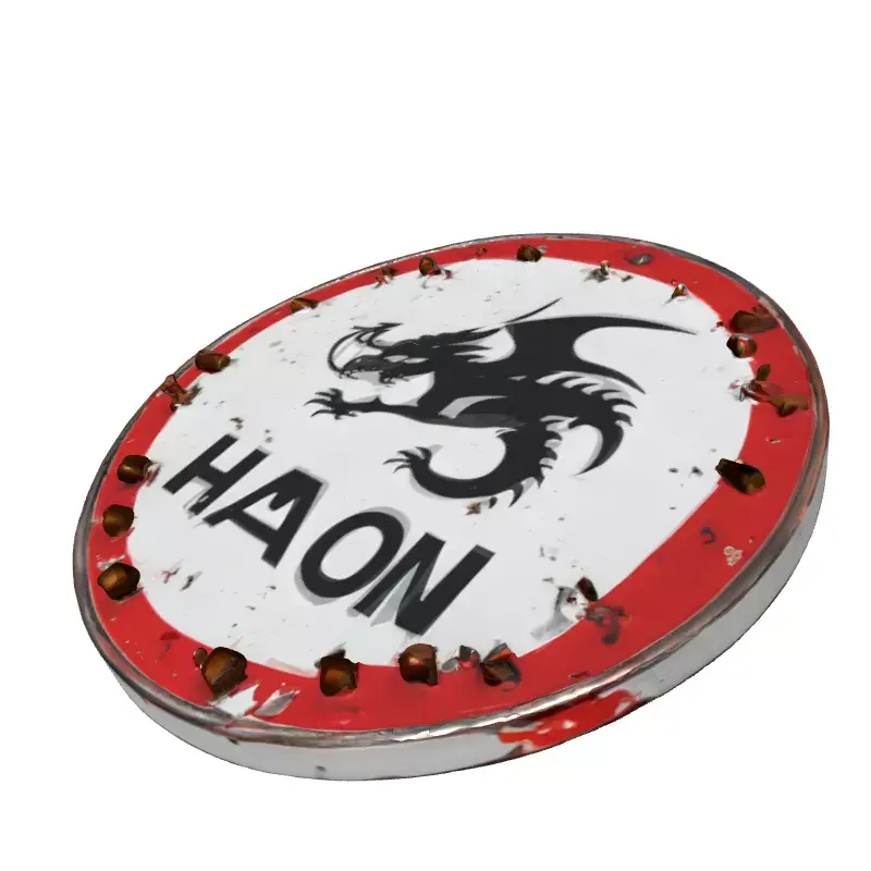 This highly detailed 3D model presents a formidable distressed dragon target shield, perfect for adding a touch of rugged authenticity to your digital environments. The circular shield features a striking black silhouette of a dragon, accompanied by the bold text HAZON, set against a worn white background framed by a chipped red border. Its surface is expertly textured with realistic PBR materials, showcasing convincing signs of age, including peeling paint, visible rust, and metallic wear. A distinctive feature is the series of spent bullet casings meticulously integrated into its rim, suggesting a history of intense use or battle. This model is ideal for game development, serving as an immersive prop in fantasy, military, survival, or post-apocalyptic settings, as well as a captivating focal point in AR/VR applications and digital art projects. It is optimized for real-time applications, ensuring smooth performance while retaining high visual fidelity, yet it also excels in static renderings for architectural visualization or cinematic scenes. The asset boasts clean topology and is fully UV unwrapped, ready for seamless integration into your preferred 3D software. Supported file formats likely include GLB, OBJ, FBX, USD, and potentially others like DAE or PLY, offering broad compatibility. Its meticulous detailing and authentic textures make it a versatile and impactful addition to any 3D asset library, providing a rich narrative element to your scenes.