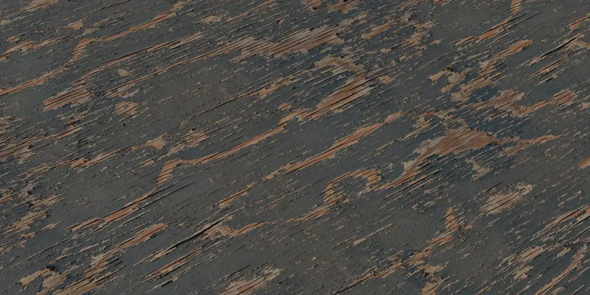 Realistic peeling paint revealing wood grain, with scratches and chips for cinematic aging and detail.