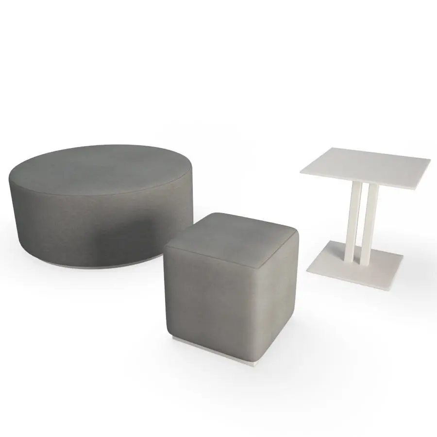 Set of poufs, coffee table and sofa modules to create a modern terrace or lounge area.