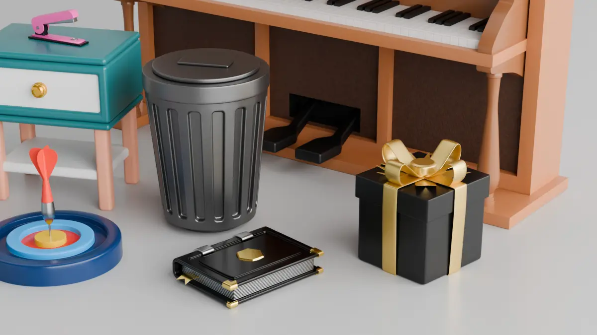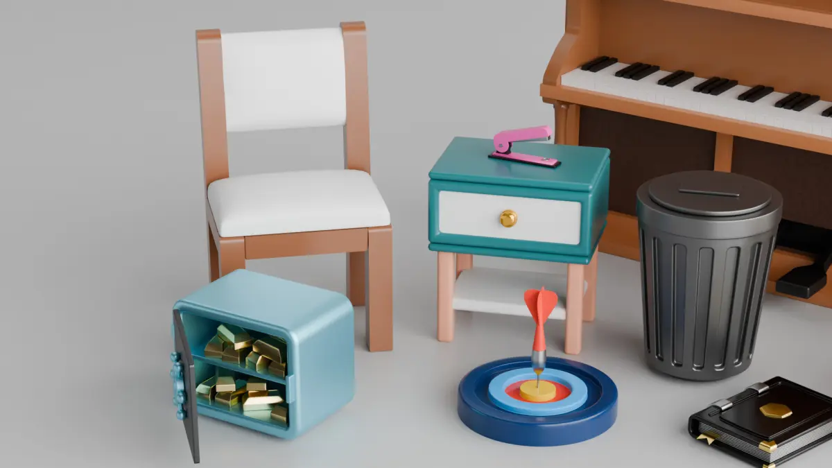 This 3D models pack includes a diverse collection of highly detailed everyday objects designed for creative projects. The pack features a wooden upright piano with intricate black and white keys, a sleek white chair with wooden legs, and a compact blue nightstand with a single drawer, topped by a pink decorative object. Additional items include a minimalist black trash can, a luxurious black gift box adorned with a gold ribbon, and a robust blue safe with its door ajar, revealing neatly stacked gold bars inside. A colorful dartboard with a dart precisely hitting the bullseye adds a playful touch, while a sophisticated black book with a gold clasp rounds out the collection. Perfect for animation, gaming, or interior design purposes, this pack offers versatility and elegance in equal measure.