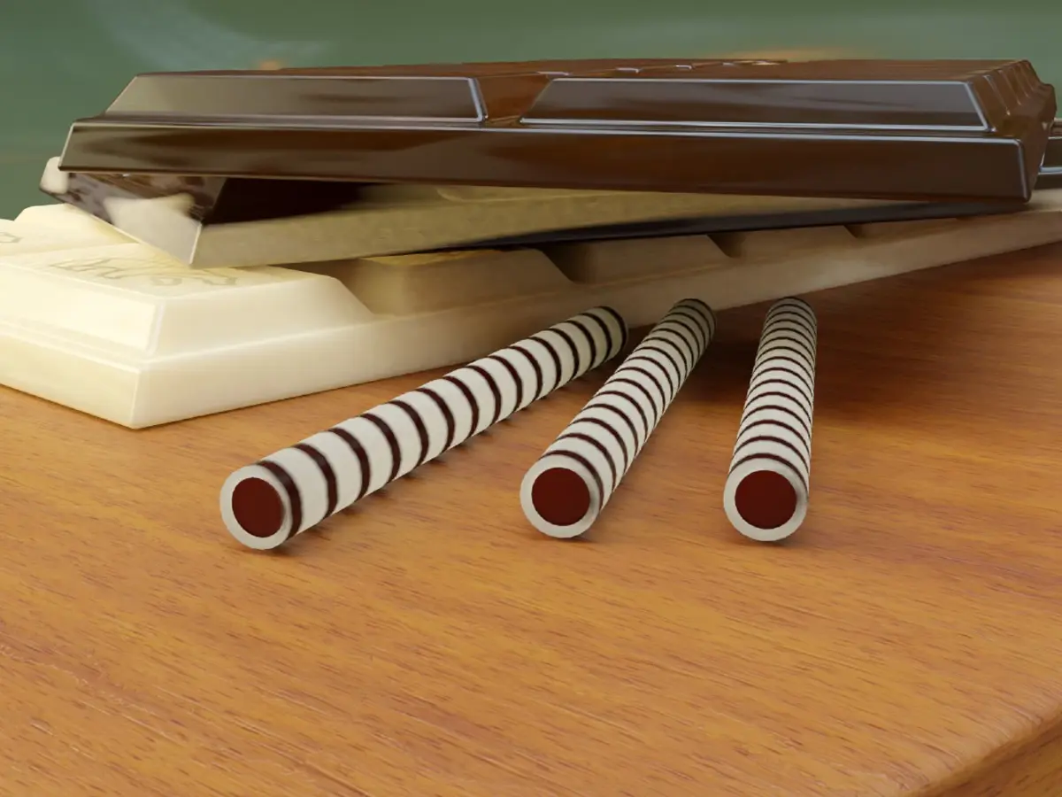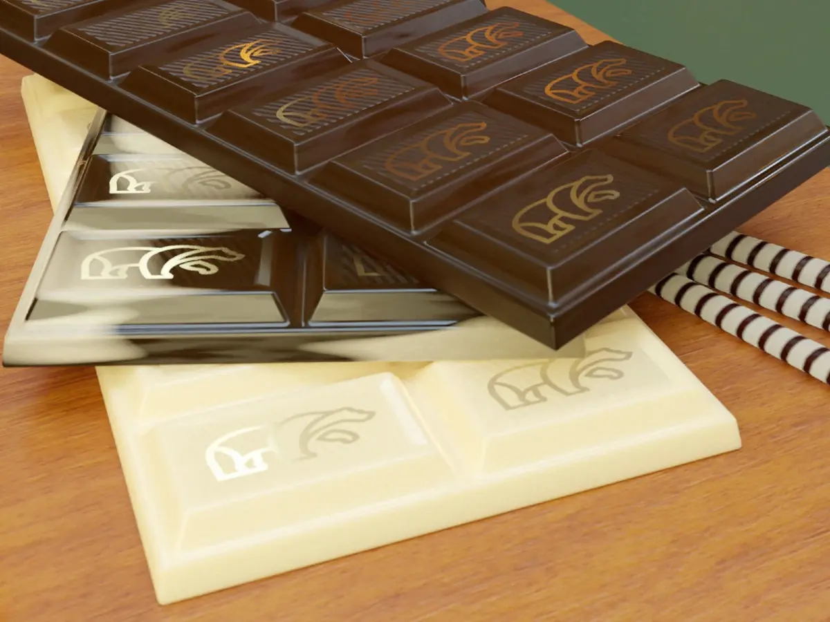 THIS MODEL CONTAINS:1 Milky Chocolate Bar with golden detais1 White Chocolate Bar with golden detais1 Double Chocolate Bar with golden detais3 Chocolate cookie tubes for decoration1 Wooden Cutting Table with PBR textures