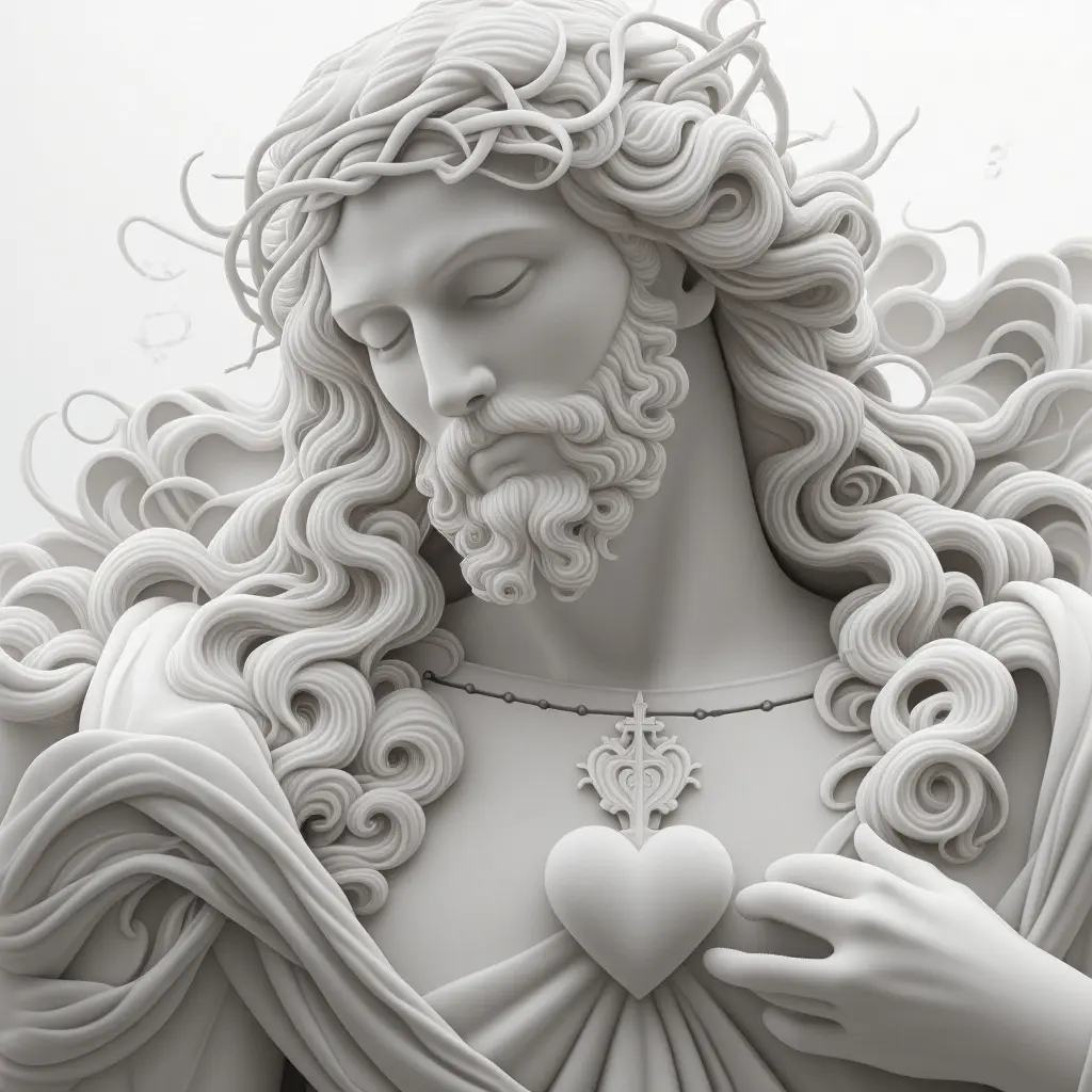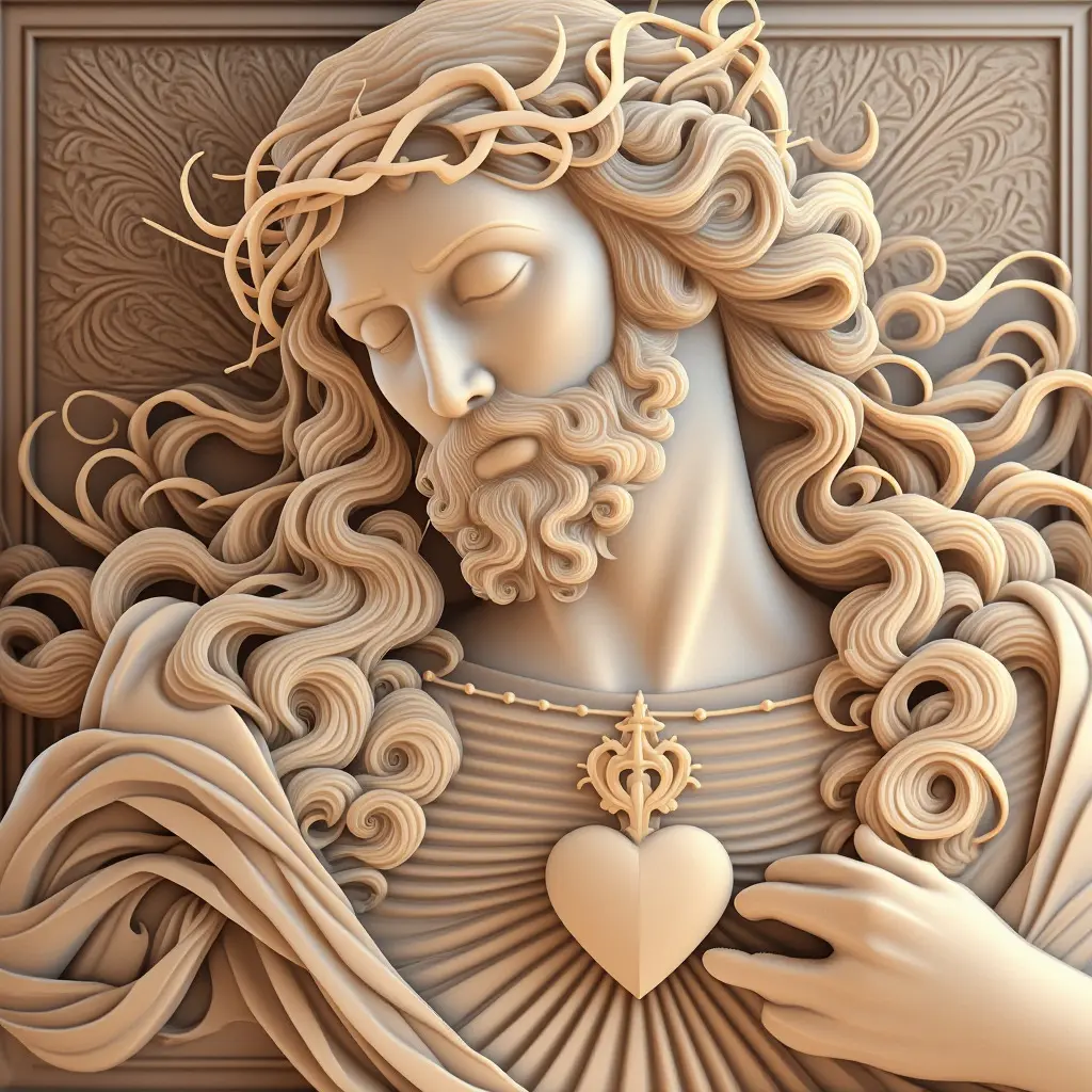 An embossed portrayal of infinite love and divine mercy. Every curl of hair and detail of the sacred heart speaks of love and faith. This spiritual masterpiece can be created in various formats: Carving on marble stones Precise carving on fine wood 3D printing with complete eleganceFrom faith to art, limitless beauty!