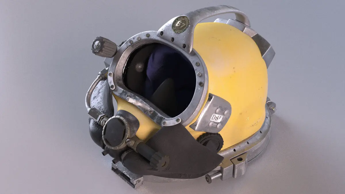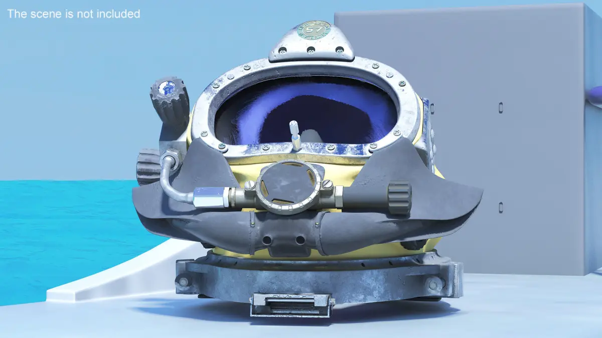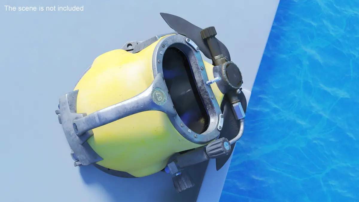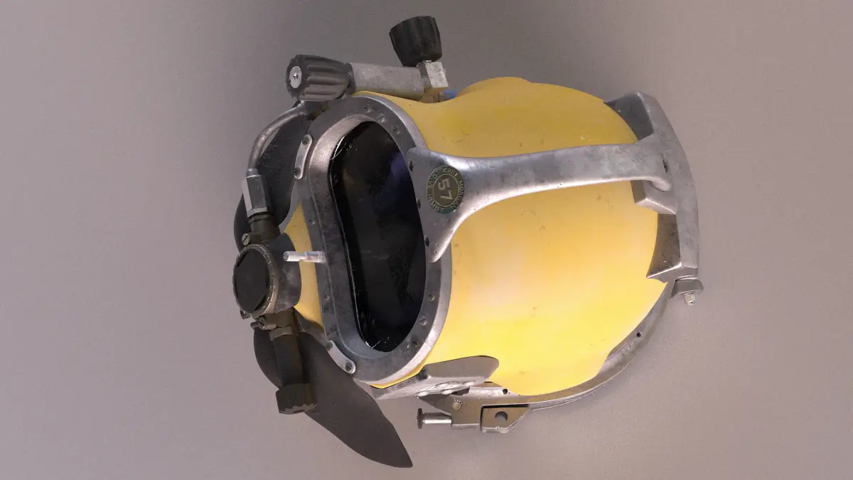 Diving Helmet Kirby Morgan 57 Used is a high quality, photo real 3d model that will enhance detail and realism to any of your rendering projects. The model has a fully textured, detailed design that allows for close-up renders, and was originally modeled in 3ds Max 2020 and rendered with V-Ray. Renders have no postprocessing!
