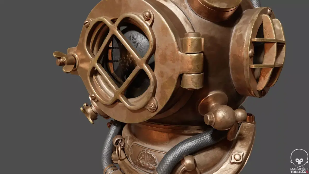 This 3D model represents a cartoon-style diving helmet created in a semi-realism style — smooth stylized shapes combined with realistic PBR materials.