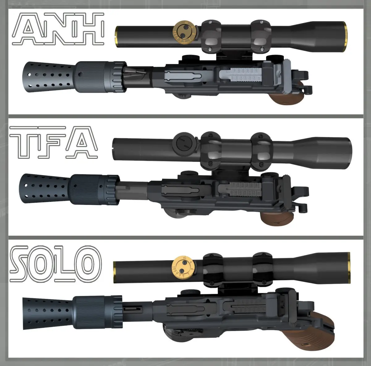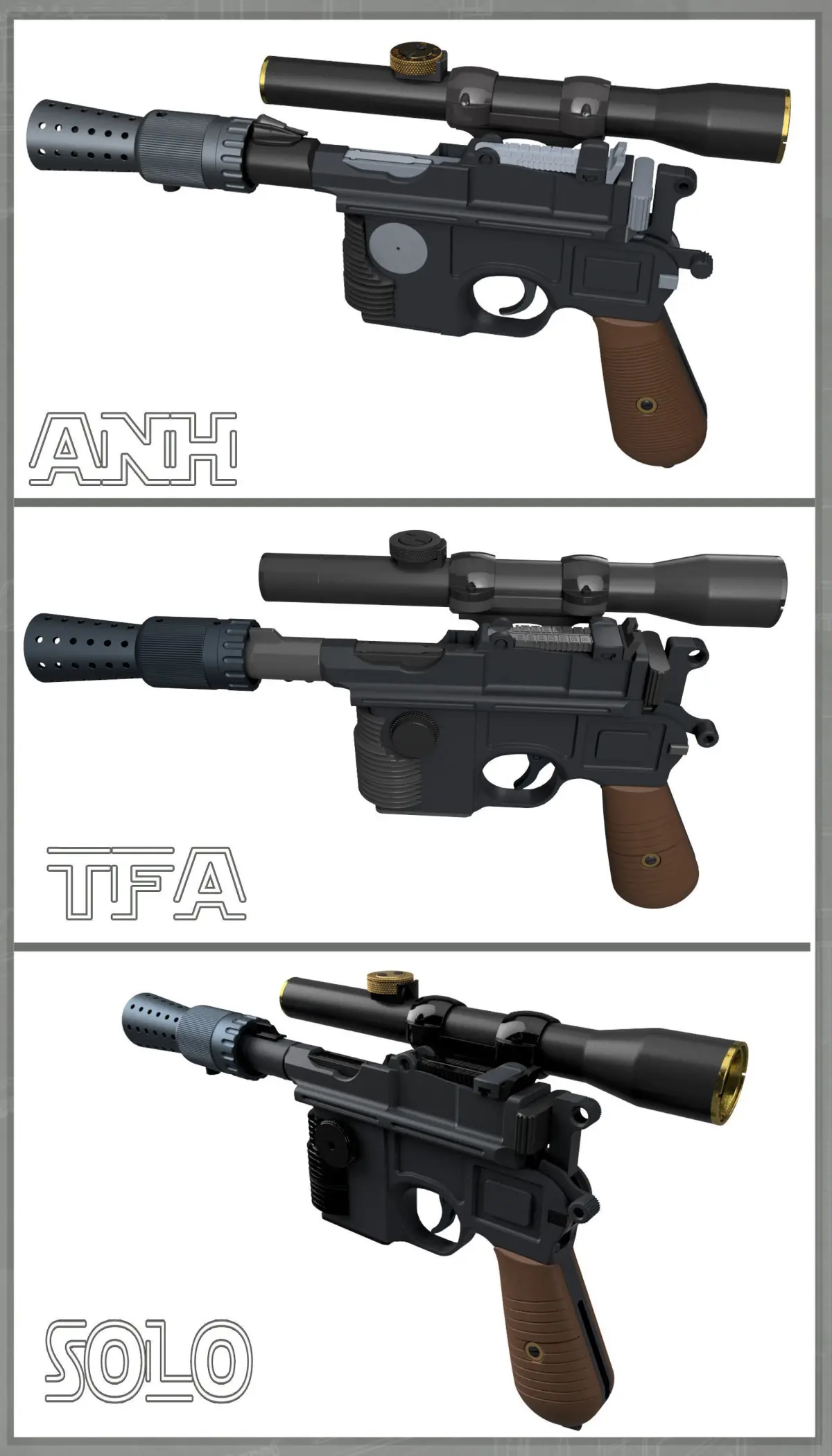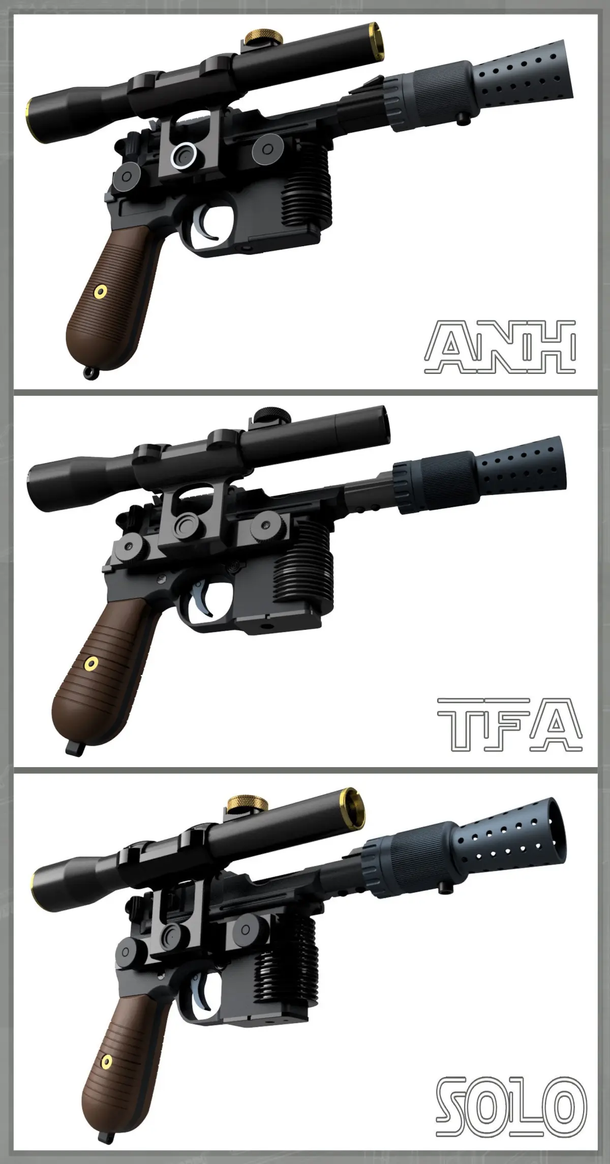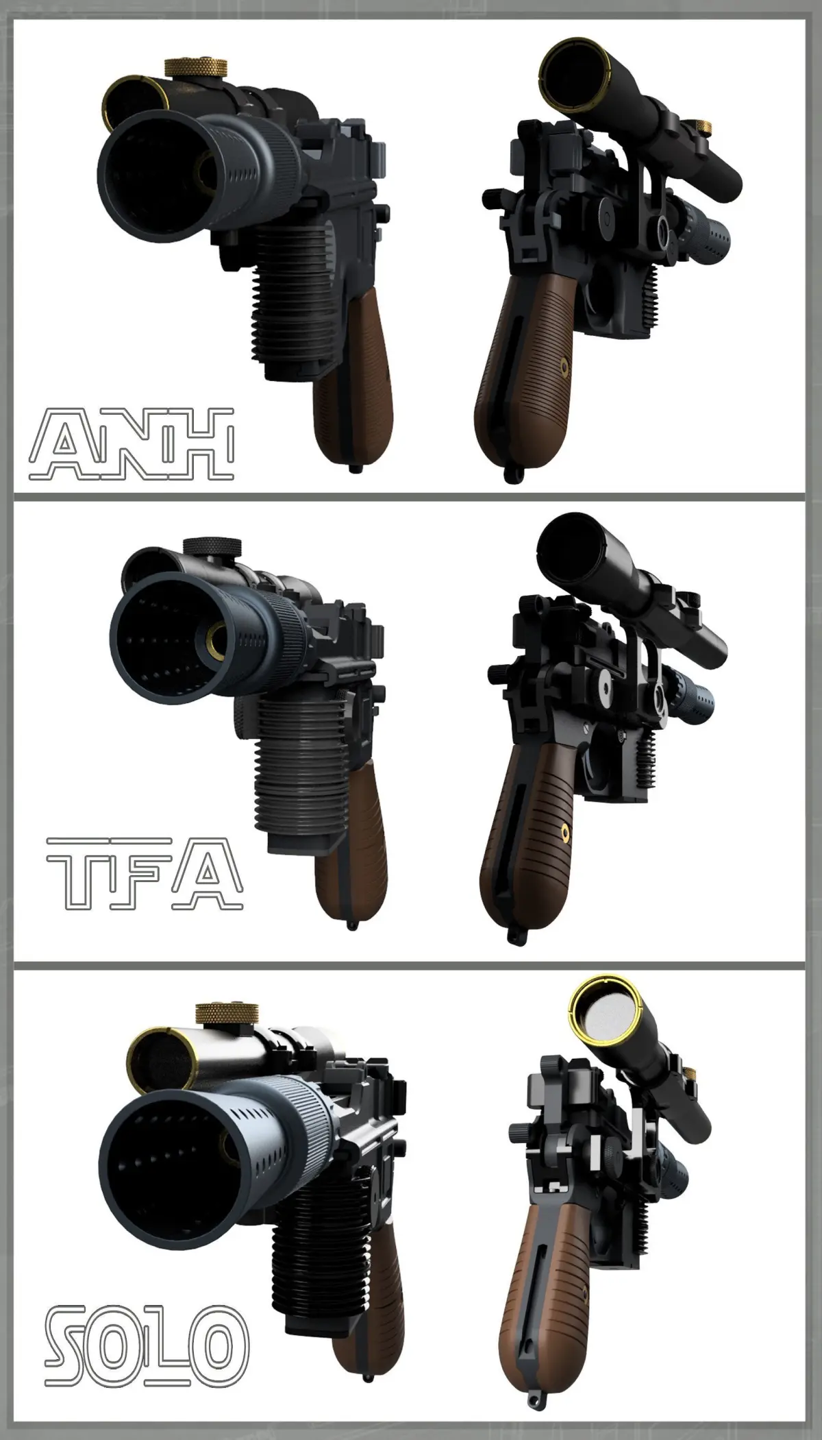 This is a three-in-one special! All three of Han's hero Blasters from A New Hope, The Force Awakens, and Solo.