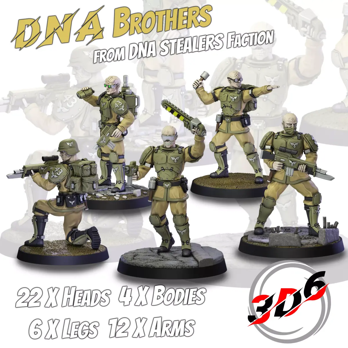 This set of DNA Brothers + Heavy Infantry Units is a great bundle of biologically modified humans suitable for proxy for any genetically altered units and creatures, including the Warhammer's 40K Genestealers Cult's Brood Brothers. This bundle includes:
