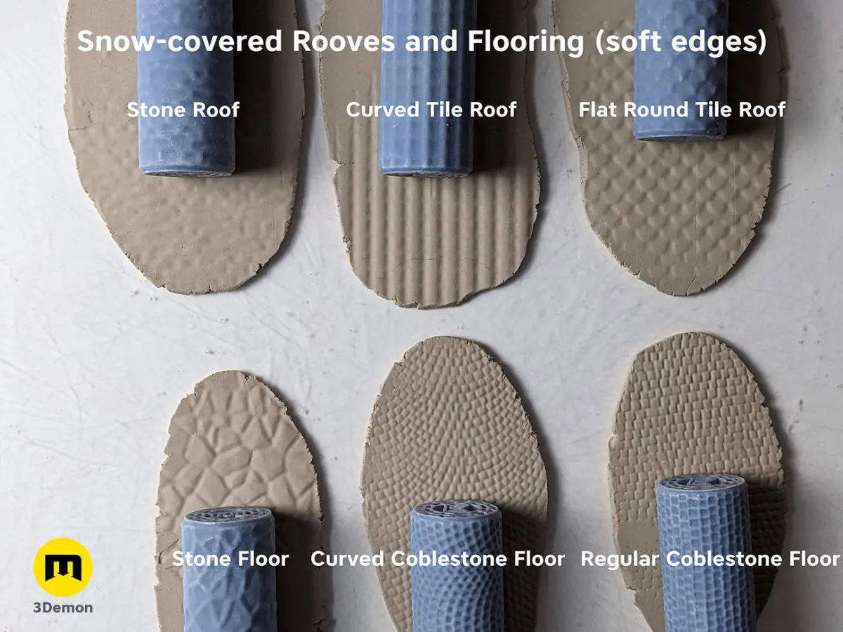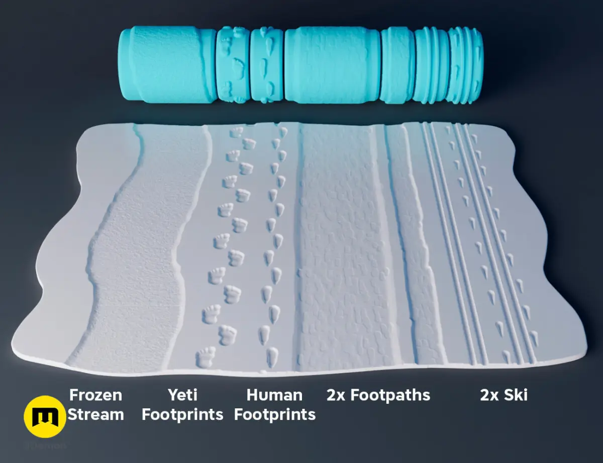 Rollers included:3x snow-covered rooves3x snow-covered pavements and roads1x human footprints in snow1x yeti footprints1x downhill skiing (no ski pole marks)1x cross-country skiing2x footpaths (lots of footprints in snow)1x frozen streamWith these rollers, you can create a winter medieval town or a snowy landscape.