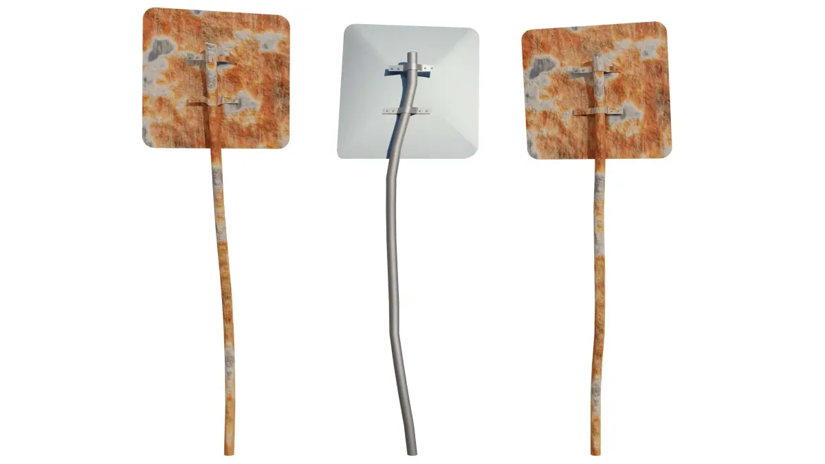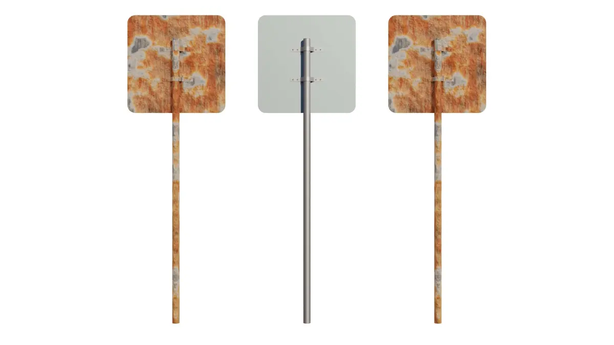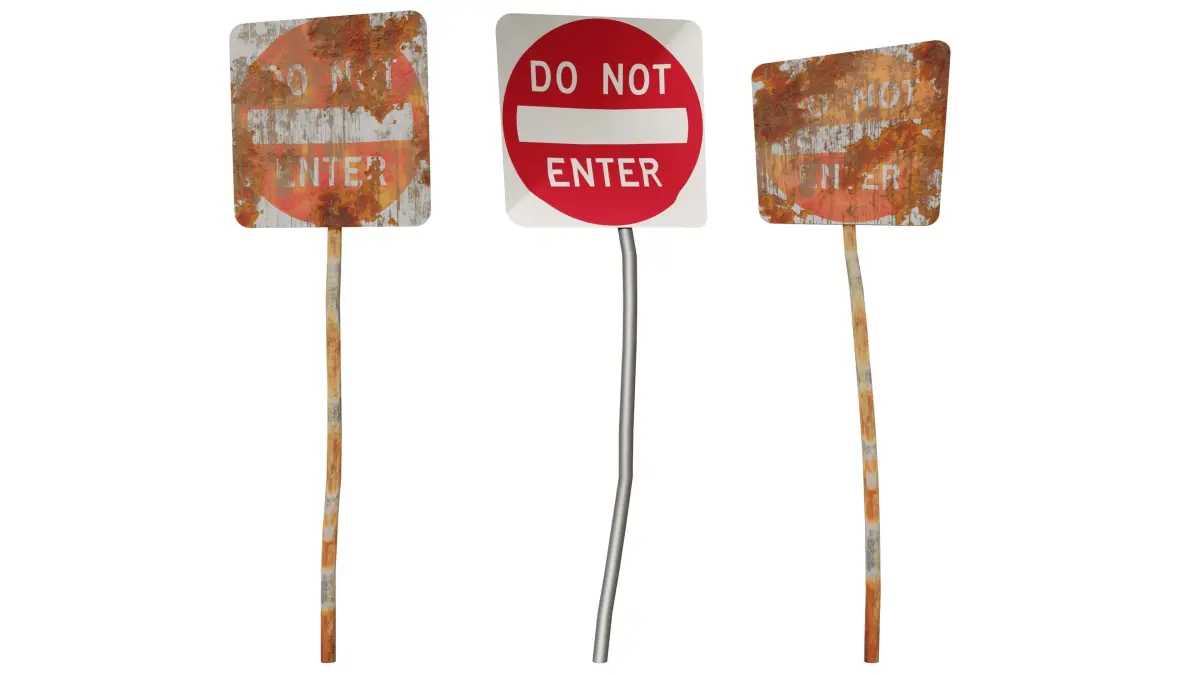 Do Not Enter signs. Square sign. Includes a Rusted version, a damaged rusted version, and a clean new version. Includes bended pole with bended signs variation, normal straight up variation, layed down signs for bended signs and normal signs variation. Check pictures to see each variation.