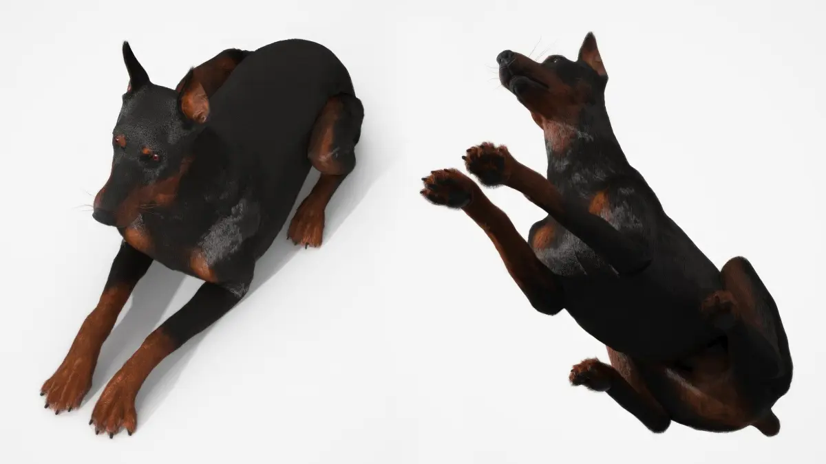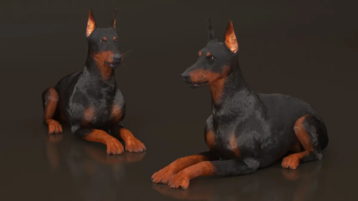 Doberman Pinscher Lying Down Fur for Cinema 4D is a three-dimensional model of specimen of popular dog that was breed for guard duties, and that is a well known guard and working dog.