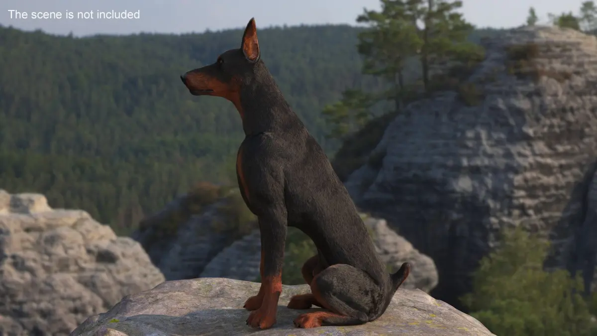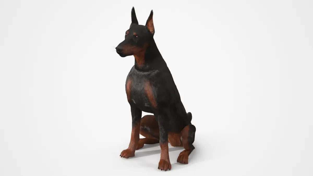 Doberman Pinscher Sits Fur for Maya is a three-dimensional model of specimen of popular dog that was breed for guard duties, and that is a well known guard and working dog.