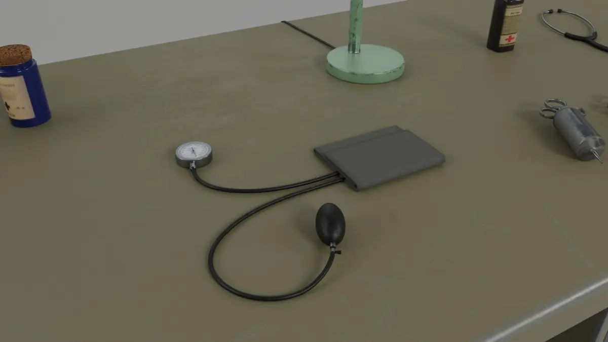 Assets: 1 table, 1 stethoscope, 1 table lamp, 1 blood pressure meter, 2 syringes, 1 first aid box and 3 bottles.