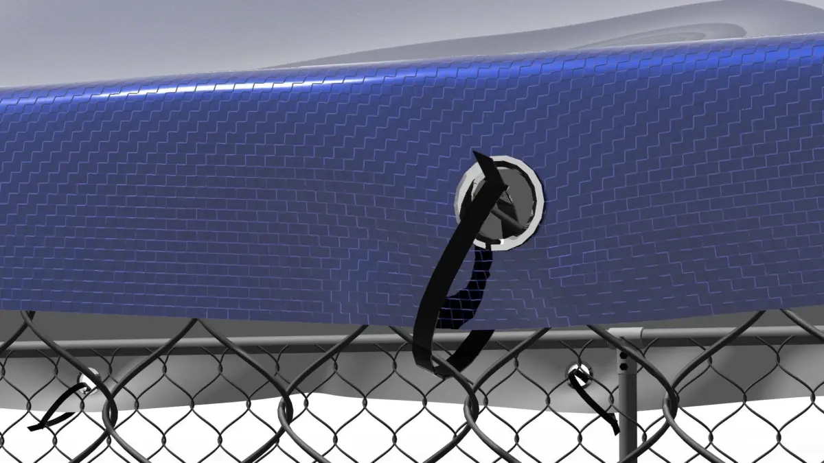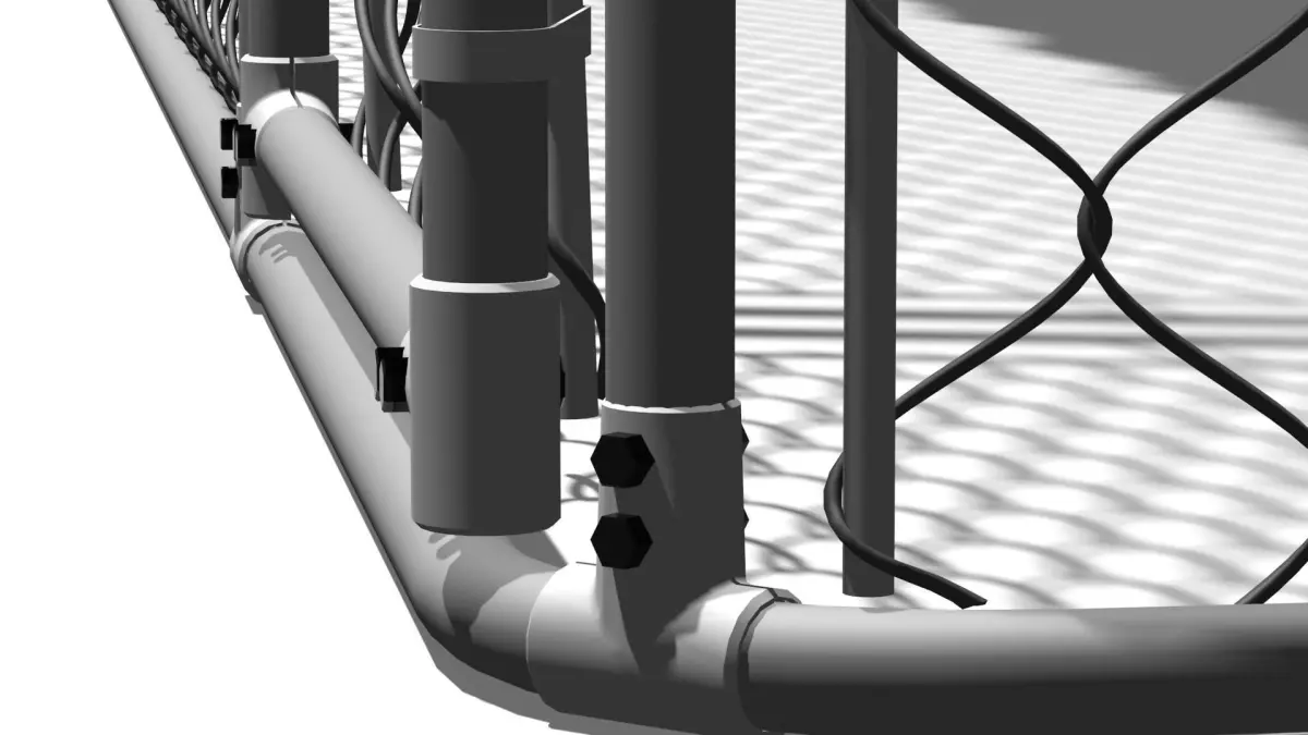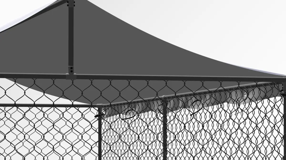 The dog enclosure is created in the dimension of 1cm. Natural size is 2.3mx4.0mx1.9m. Covered with draped awning. Has a lockable wicket door, hinged. Hinges unrigged, but, have aligned pivots.All vertical planes are covered with a rabitz polygonal mesh. With the exception of the wicket - all walls are covered with a single piece of rabitz mesh. The awning was added with the cloth modifier, its stretching was accentuated by the fastening rings, fixed with ties on the mesh of the railing and the supporting tubes of the frame. The awning is textured for example by physical texture, in order to emphasize the resulting drapery.Wicket lock and hinges, as well as frame t-connectors are detailed with (threaded) fasteners.