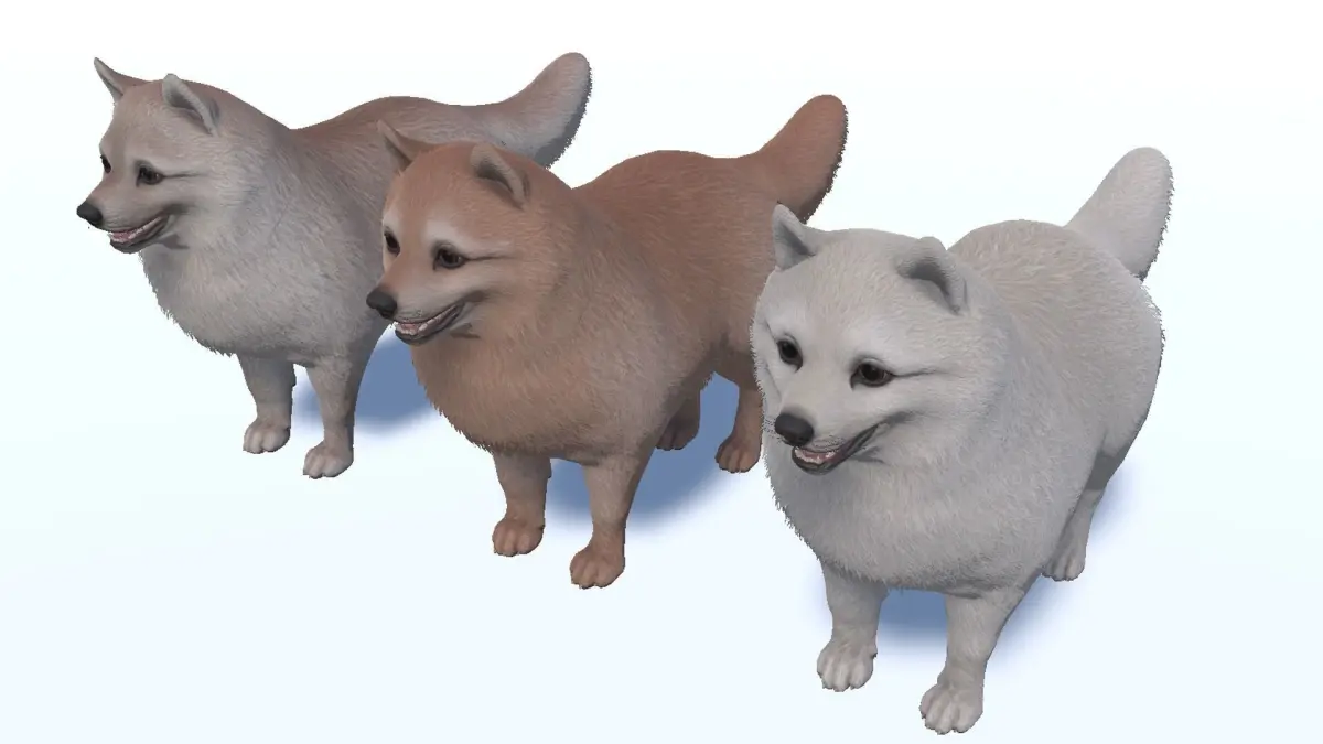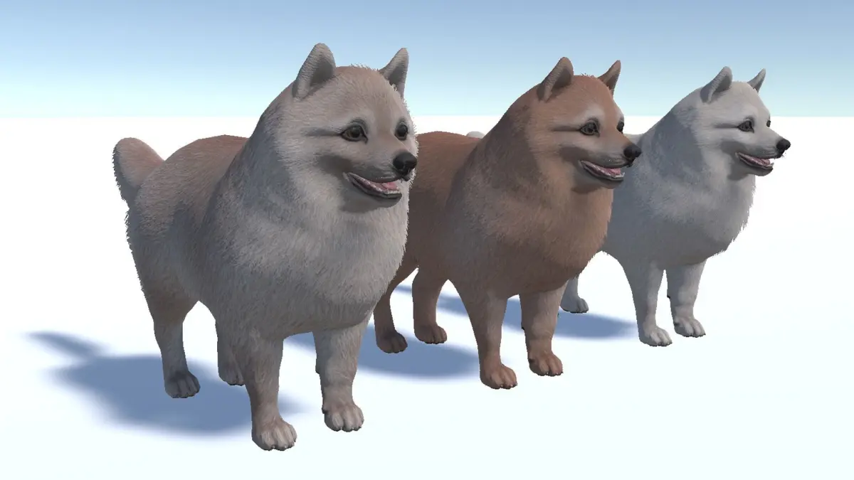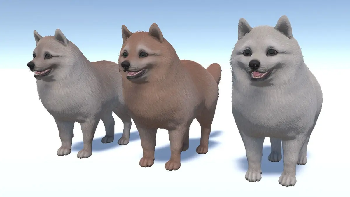 Attack (bite, front, left, right, jump), hit (front, back, middle), death (left, right), digging (start, loop, end), bark, idle 1-7, eat, eat tear, drink, lie 1-2, lie belly 1-2, sleep, sleep belly, 15 stages jump (start, start forward, start place, fly up, fly up forward, fly horizontal, fly down high, fly down high forward, fly down low, fly down low forward, land, land forward, land place, fall edge, hooked and climbed), jump (forward, run, place), crouch move (front, lefr, right, back, back left, back right), crouch (idle 1-2, turn left, turn right), walk (front, lefr, right, back, back left, back right ), trot (front, left, right), run (front, left, right ), run fast (front, left, right ) swim (enter, front, lefr, right, back, back left, back right ), turn (left, right), turn 180 (left, right ), sitting (start, end, idle 1-2), pissing, defecation, scratch ear, pick up, etc.