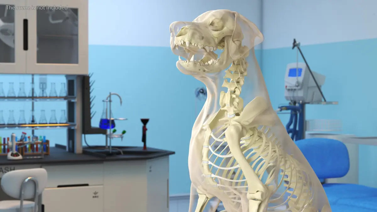 Dog Skeleton Anatomy with Translucent Shell Rigged for Cinema 4D is a three-dimensional model of canine skeletal structure with a transparent skin envelope, which represents the framework of bones supporting a dog's body.