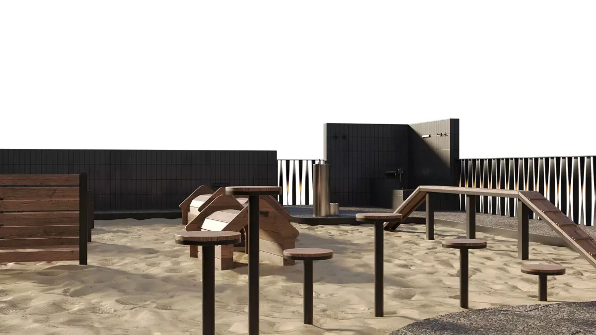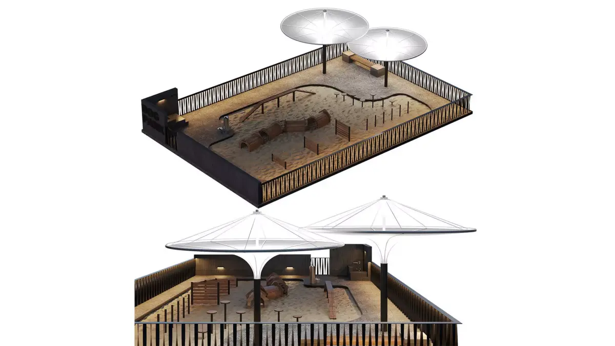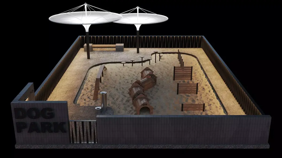 Dog walking area (also set up for night lighting, just turn on the lights)The scene includes a drinking fountain, a fence, a canopy (umbrella), a bench, hexagonal tiles, a sand area, a barrier, a bridge, a tunnel, a slalom, and a dog shower.