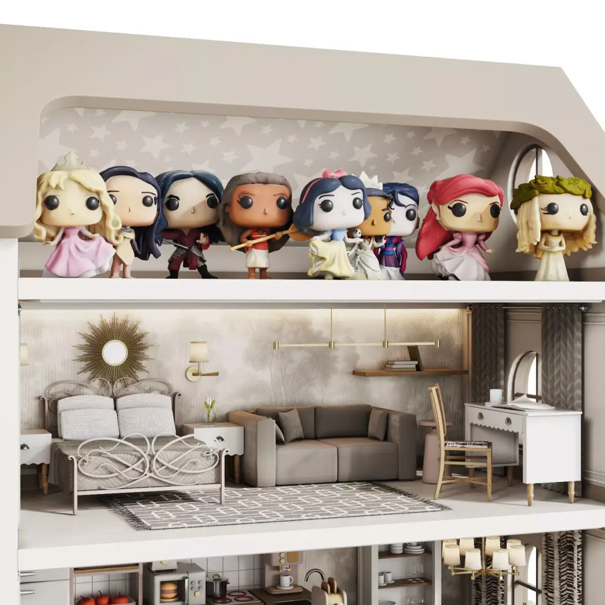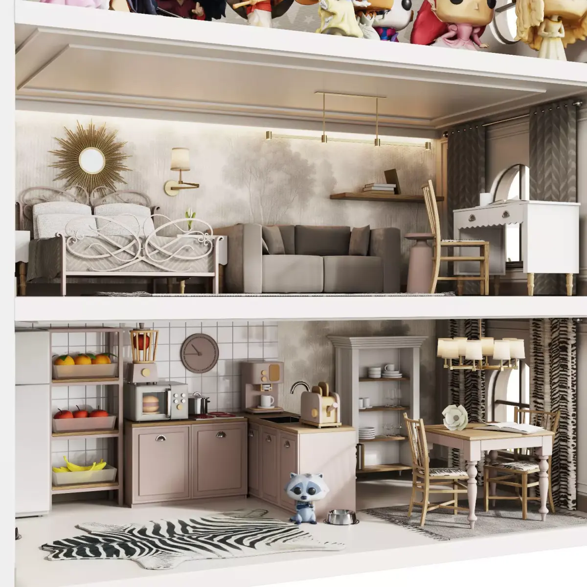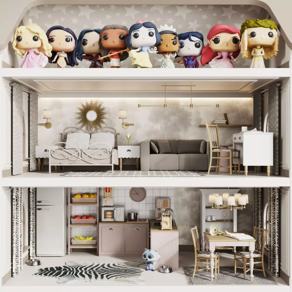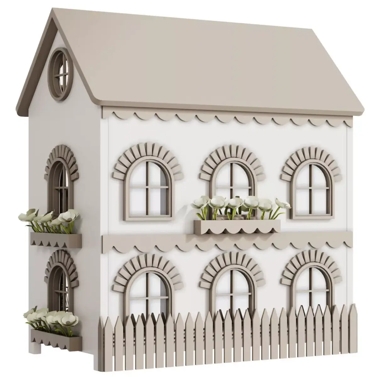3ds Max version – 2020. Polygon count without smoothing (fully closed stack): 383,344Corona 11 version: Materials CoronaPhysicalMtl + CoronaLegacyMtl (obtained via conversion). In Corona Render versions 6 and below CoronaLegacyMtl = CoronaMtl.Vray 5: (obtained via conversion).The model uses children's dollhouse furniture:Kitchen – refrigerator, fruit shelves, kitchen with countertops, blender, coffee maker, toaster, dishes, pendant lights, rug, pet bowls, flowers, carpetDining room – dining table, chairs, wall-mounted dish cabinet, chandelier, table settingLiving room – sofa, coffee table, chandelier, sun mirror, side cabinetsBedroom – bed, desk, chair, bookshelves, wall sconces, decorative vases, bedside tableThe model is logically grouped, and for distant shots the façade decorations can be removed.Perfectly suited for a themed children’s room, for a teenager, or for adult fans in a study