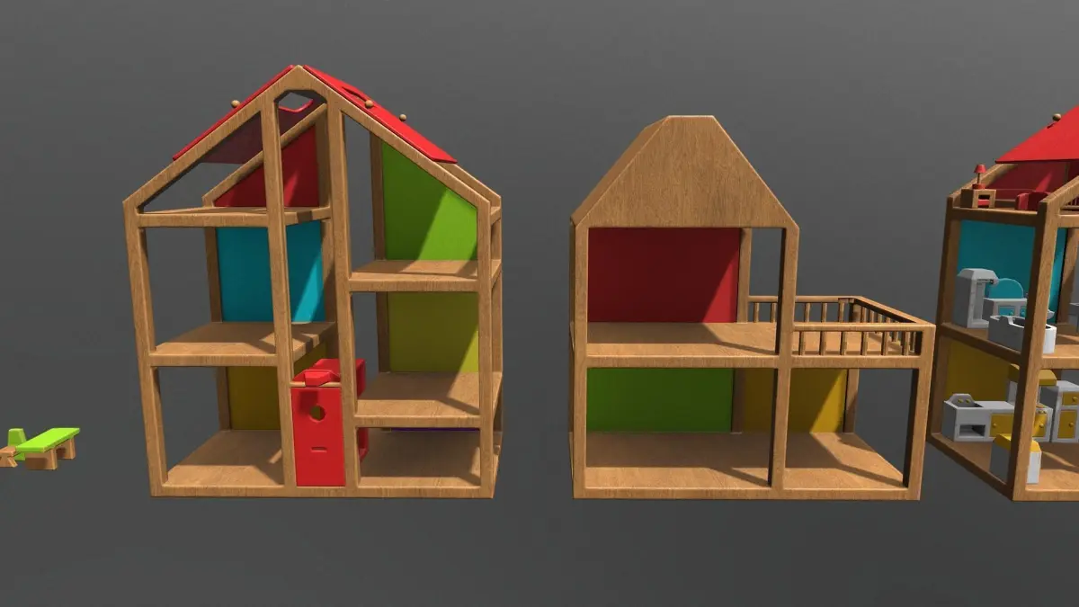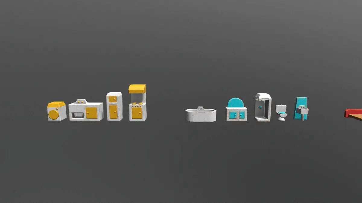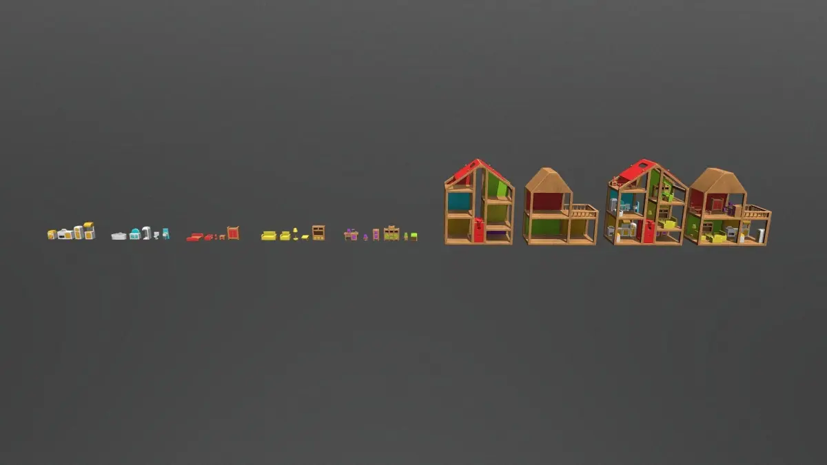 Includes 25 furniture pieces, 2 house models (with seperate door, lift, roof pieces) and 2 fully furnished houses joined into one mesh.