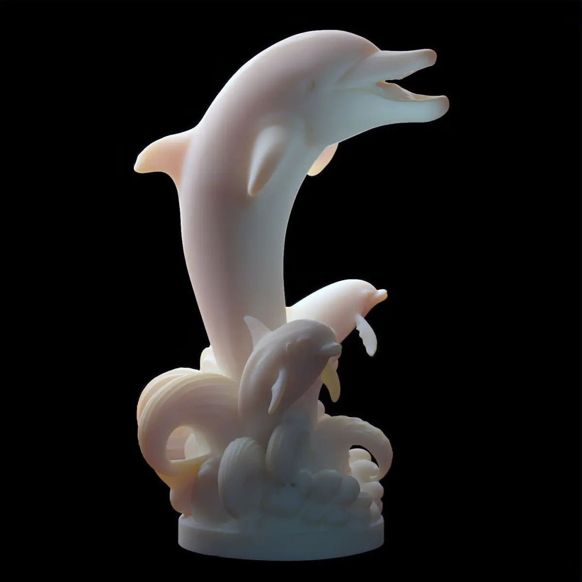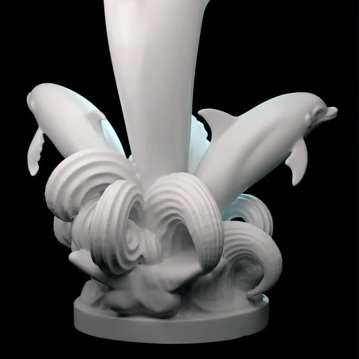 Form: Vertical composition with three dolphins in a leaping pose, intertwined with stylized waves and seabed elements such as corals and rocks. Style: Smooth, semi-realistic design with cartoon-like charm. Flowing lines and exaggerated motion convey joy and fluidity. Base: Round platform base for easy printing and stable display. Details: Includes subtle wave crests, sea textures, and dolphin facial features for an aesthetically pleasing display even in monochrome resin or filament.