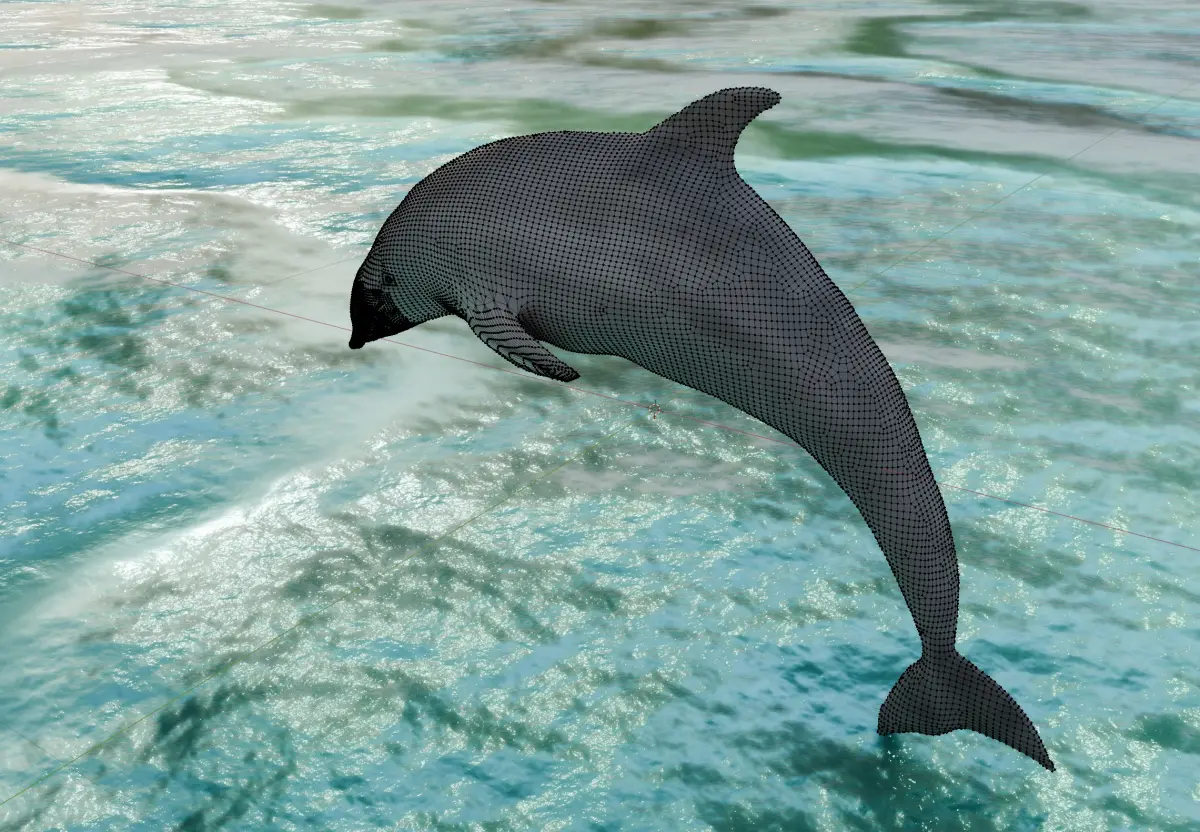 A dolphin jumping. 16k verts / 32k faces. Vertex colors with a separate material for shiny black eyes.