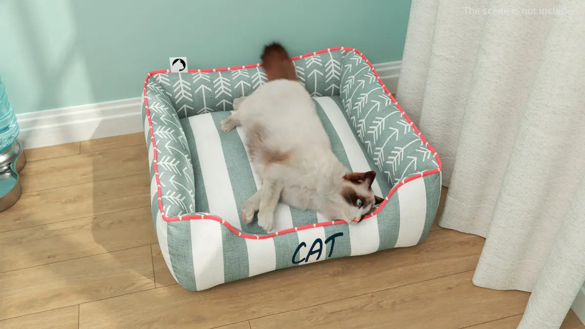 For pet product visualization, home decor design, advertising, animal-themed animation, virtual staging, furniture catalogues, educational illustrations, 3D art projects, VR/AR environments, pet accessory promotions, and digital storytelling scenes requiring a realistic depiction of a domestic cat in a cozy setting.