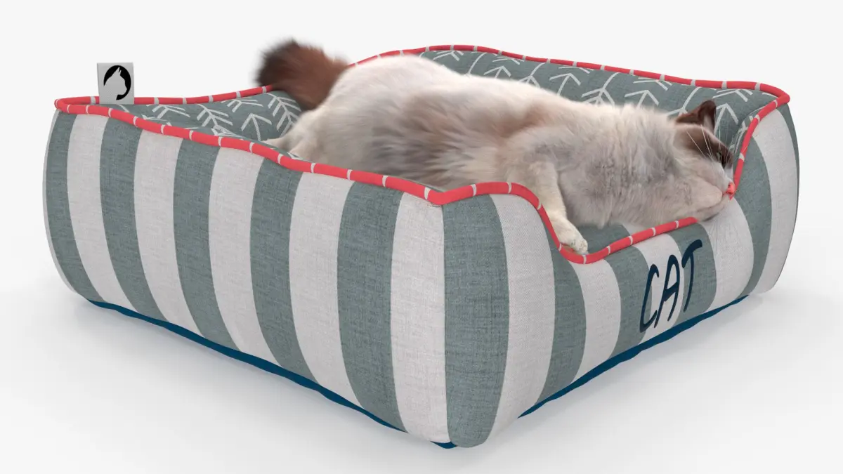 Crafted with high-detail fur textures and realistic fabric materials, this model captures the lifelike posture and softness of a domestic cat at rest. The cushion features patterned and striped textile details with contrasting borders, emphasizing both comfort and visual appeal. Its natural pose and expressive detailing make it ideal for realistic interior or lifestyle renderings.