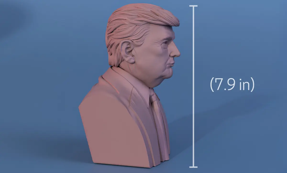 Designed for Print, Paint, and Display: My goal with each model is to make it as enjoyable to paint and display as it is to print. This bust strikes a perfect balance between realistic detail and stylized artistry, so it looks incredible right out of the printer and even better once painted.A Historic Nod to 2024: This piece captures Trump as he is in 2024, with that legendary ear notch—forever a symbol of his journey and resilience.Two Resolutions:: Choose between high and medium resolutions to fit your setup and printing needs, whether you're a hobbyist or a pro. No matter your experience level, this model is crafted to make the printing process enjoyable and the final piece impactful.