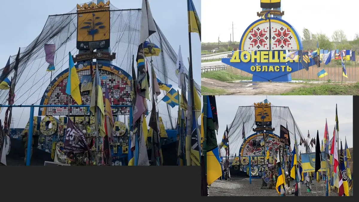 You are looking at the entrance sign to the Donetsk region of Ukraine, where the war with russia is currently underway in 2025. This is a very symbolic place, as Ukrainian soldiers constantly pass by this entrance sign and leave a memory of themselves in the form of a chevron, flag or inscription. It is a symbol of resilience, a symbol of resistance to aggression, a symbol of the fight against the horde from the east. These brave men enter the gates of the hell of battle.Let us remember every soldier who died for the Ukrainian people and everyone who is defending Ukraine from the russian army right now.