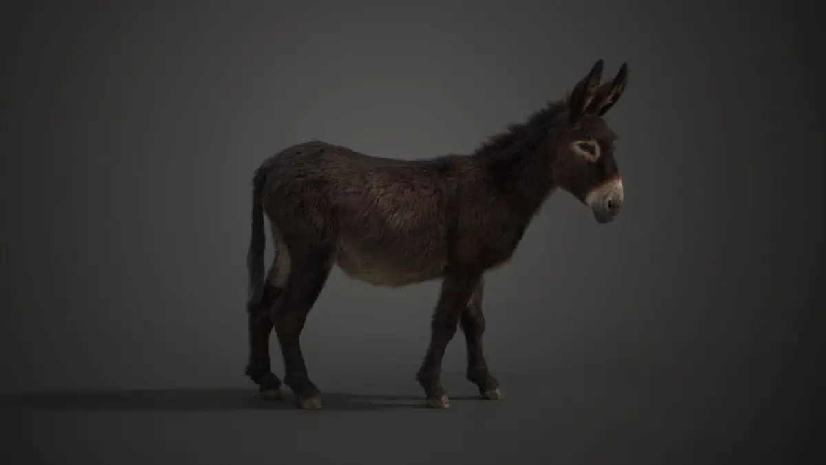 This is a high-quality donkey in winter, with multiple 4K textures, fur, rigging, and animations. It's made with Blender and Cycles renderer at real-world scale.