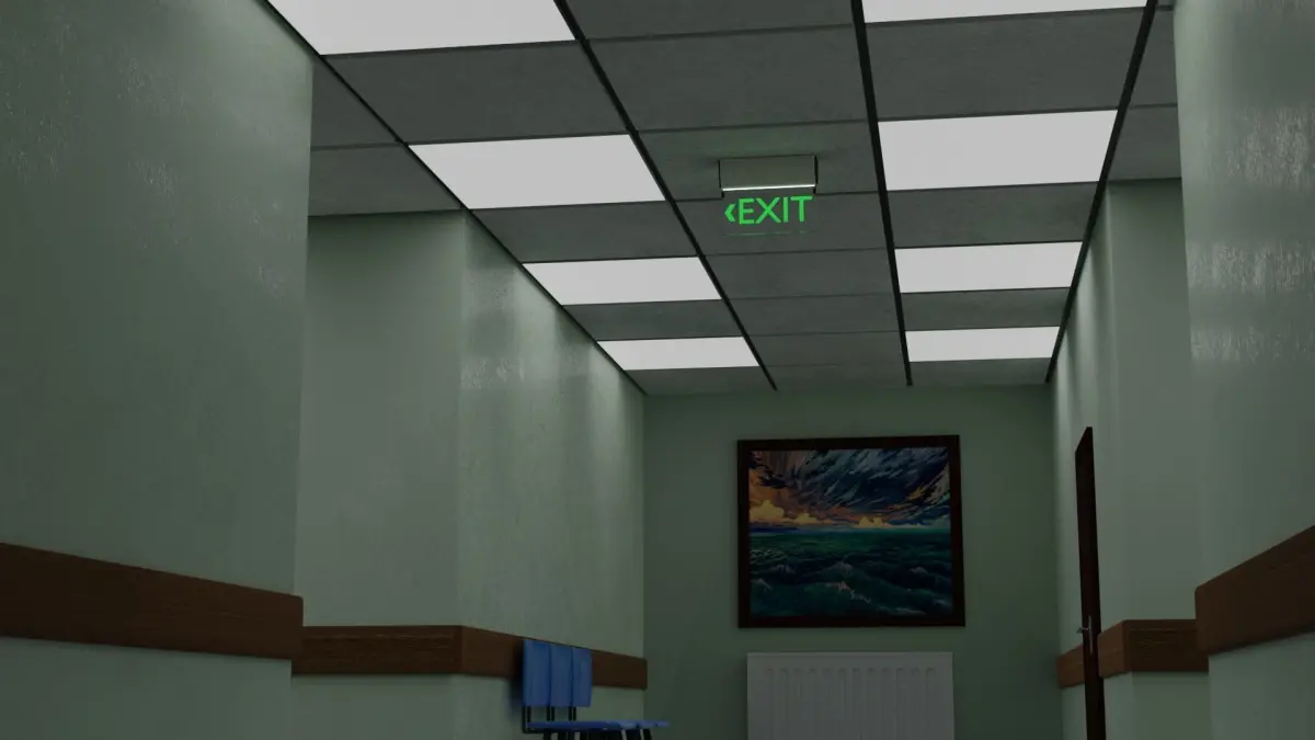 This exit sign made for public buildings like school, hospital etc. Its minimalist and pleasant design makes it suitible for most projects. Can be used in dark theme environments like night time school or hospital, the dim light it emits makes the environment more realistic and pessimistic.