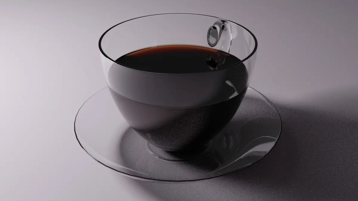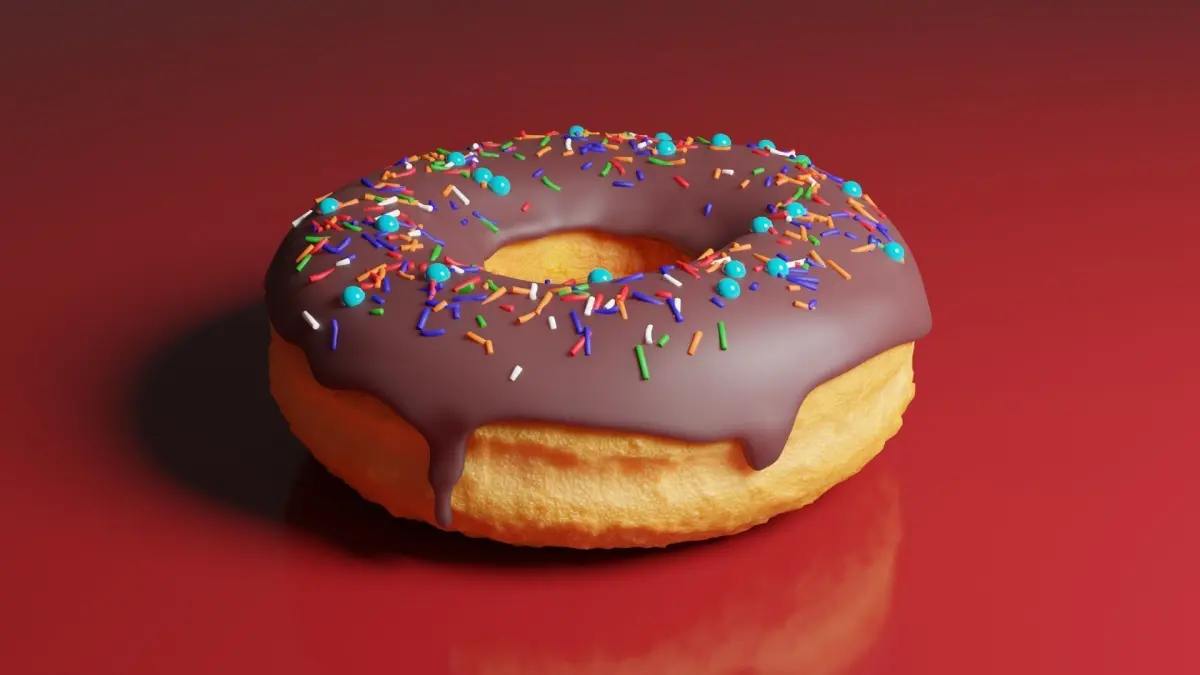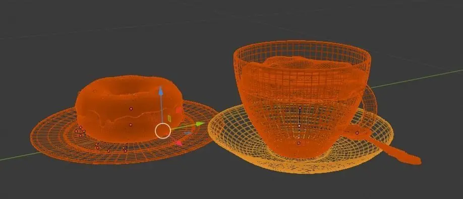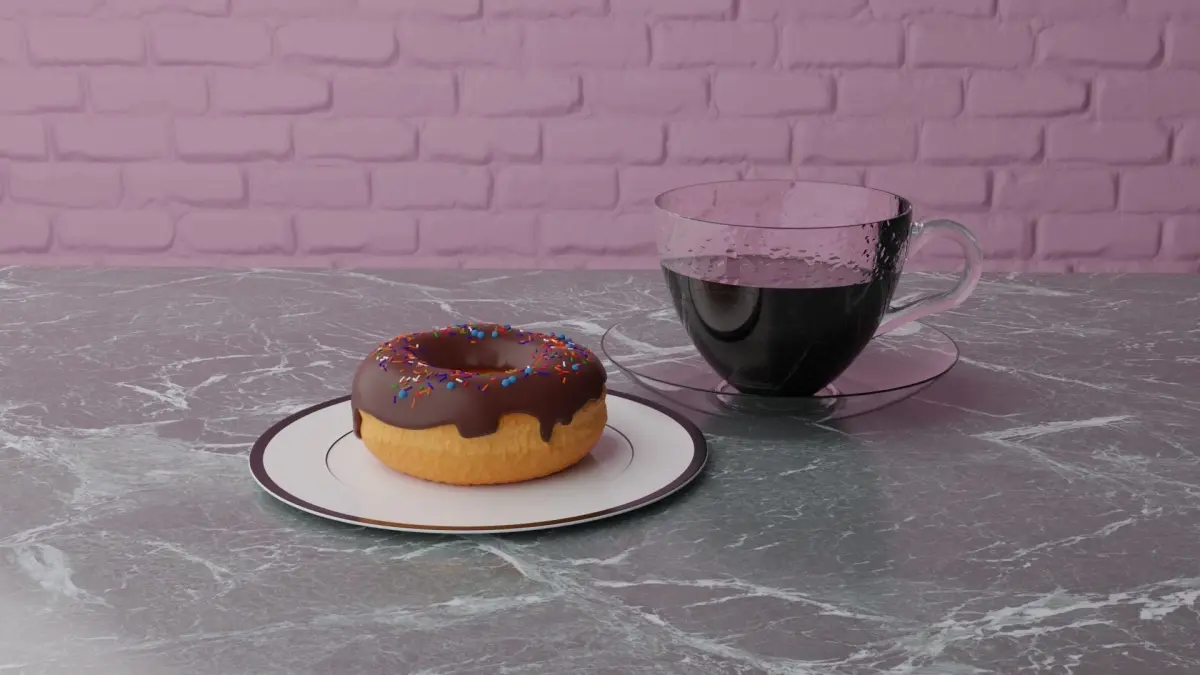 Donut with coffee on the marble surface. Everything has its own material.On the stage there is: a light source and a camera, a donut with cup coffee and two plates, the surface of the wall and table.