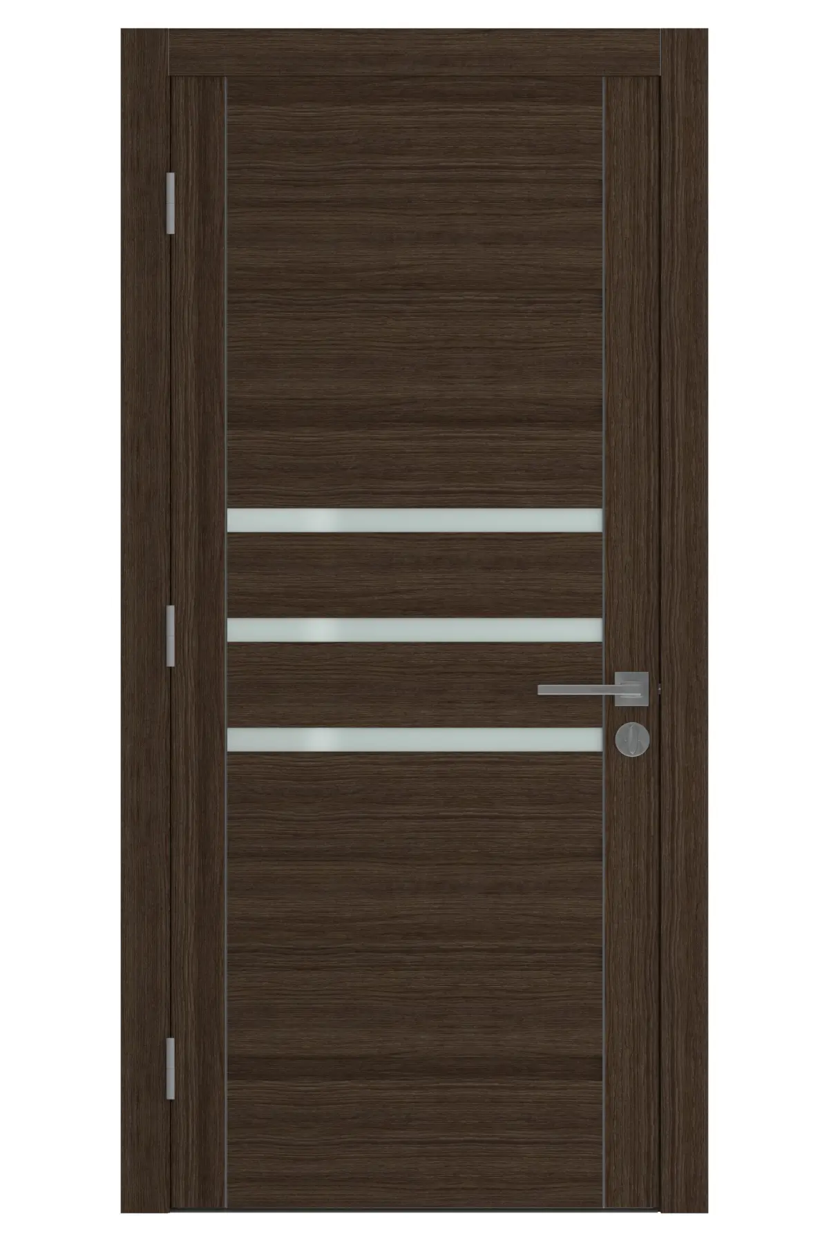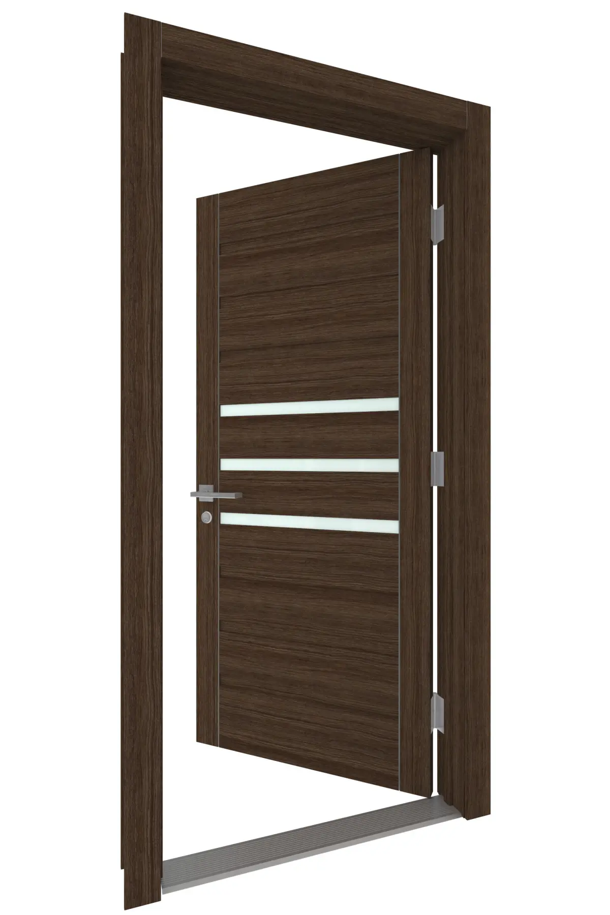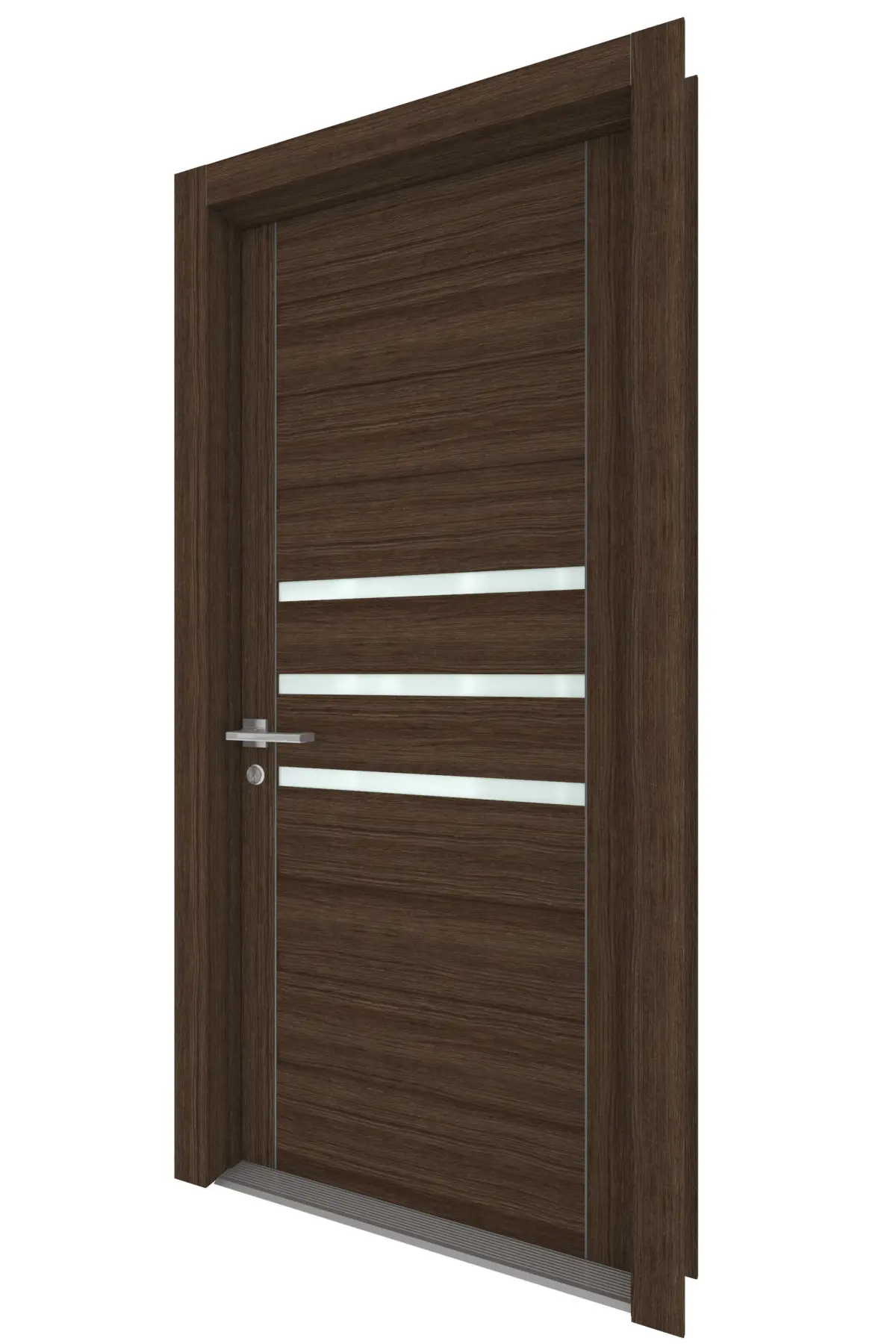 High Detail 3d Model of a modern Dark Wood Door with Wood Panels and Inset Small Wood Panels and small frosted glass lites