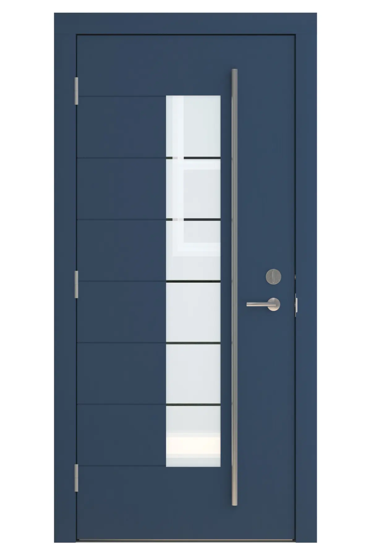 High Detail 3d Model of a modern Blue Wood Door with Frosted Glass Windows and Translucent Glass Strips that follow Door Horizontal lines, Large Aluminum Door Pull and other hardware included.