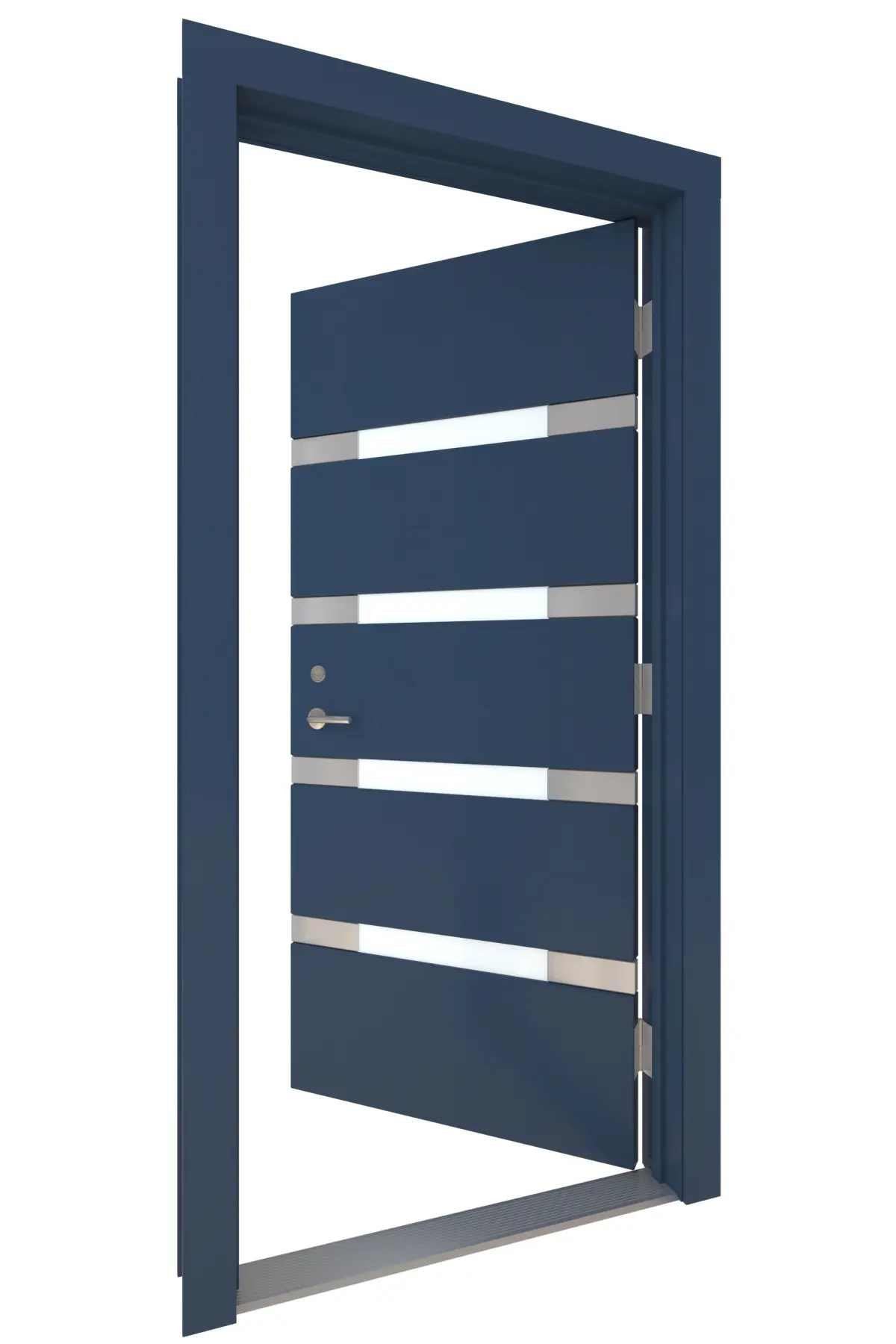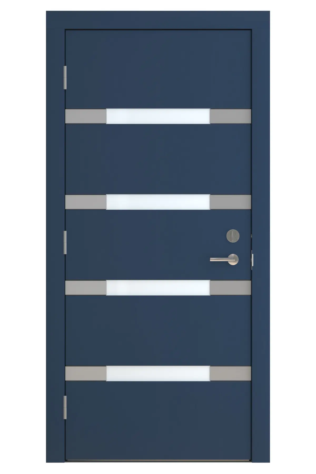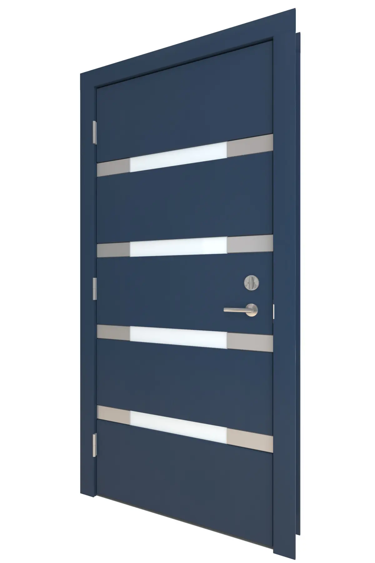 High Detail 3d Model of a modern Blue Wood Door with Frosted Horizontal Glass Windows and Aluminum Side Detail Strips, Large Aluminum Door Pull and other hardware included.