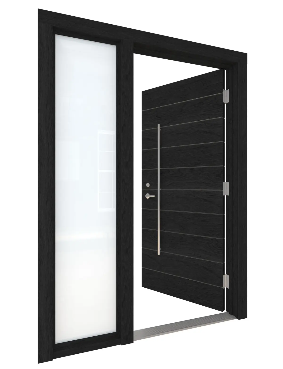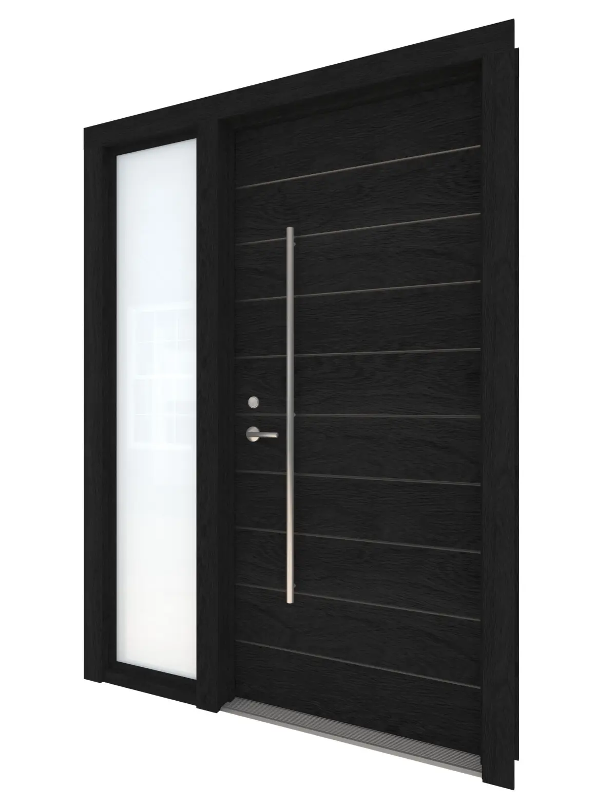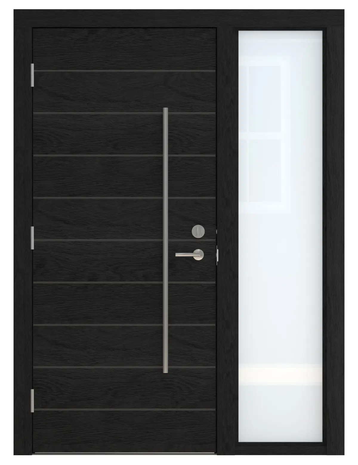 High Detail 3d Model of a modern Black Wood Door with Glass Side lite on Left Side of Door. Door has Aluminum Horizontal Detail Strips, Large Aluminum Door Pull and other hardware included. Door wood grain can be seen.