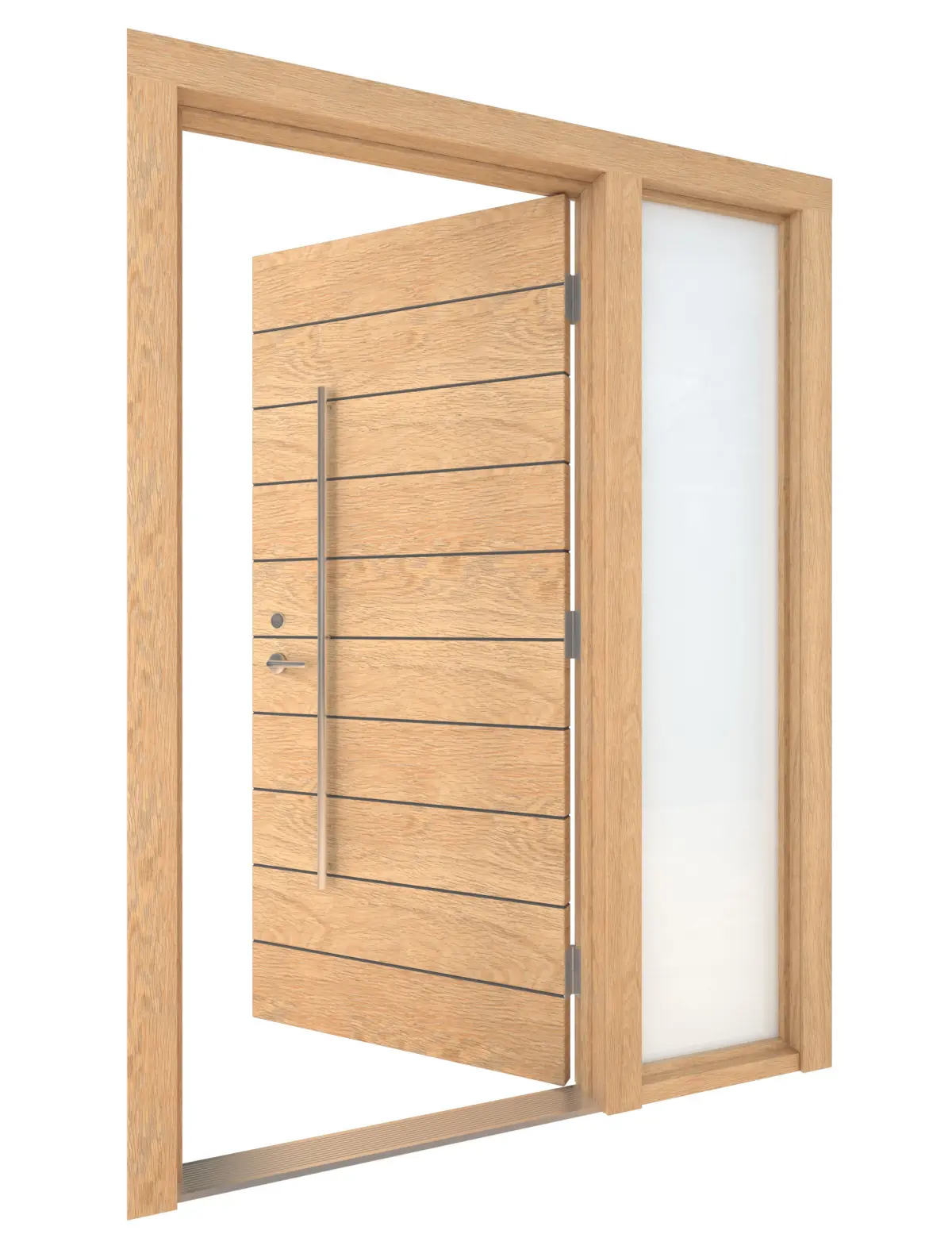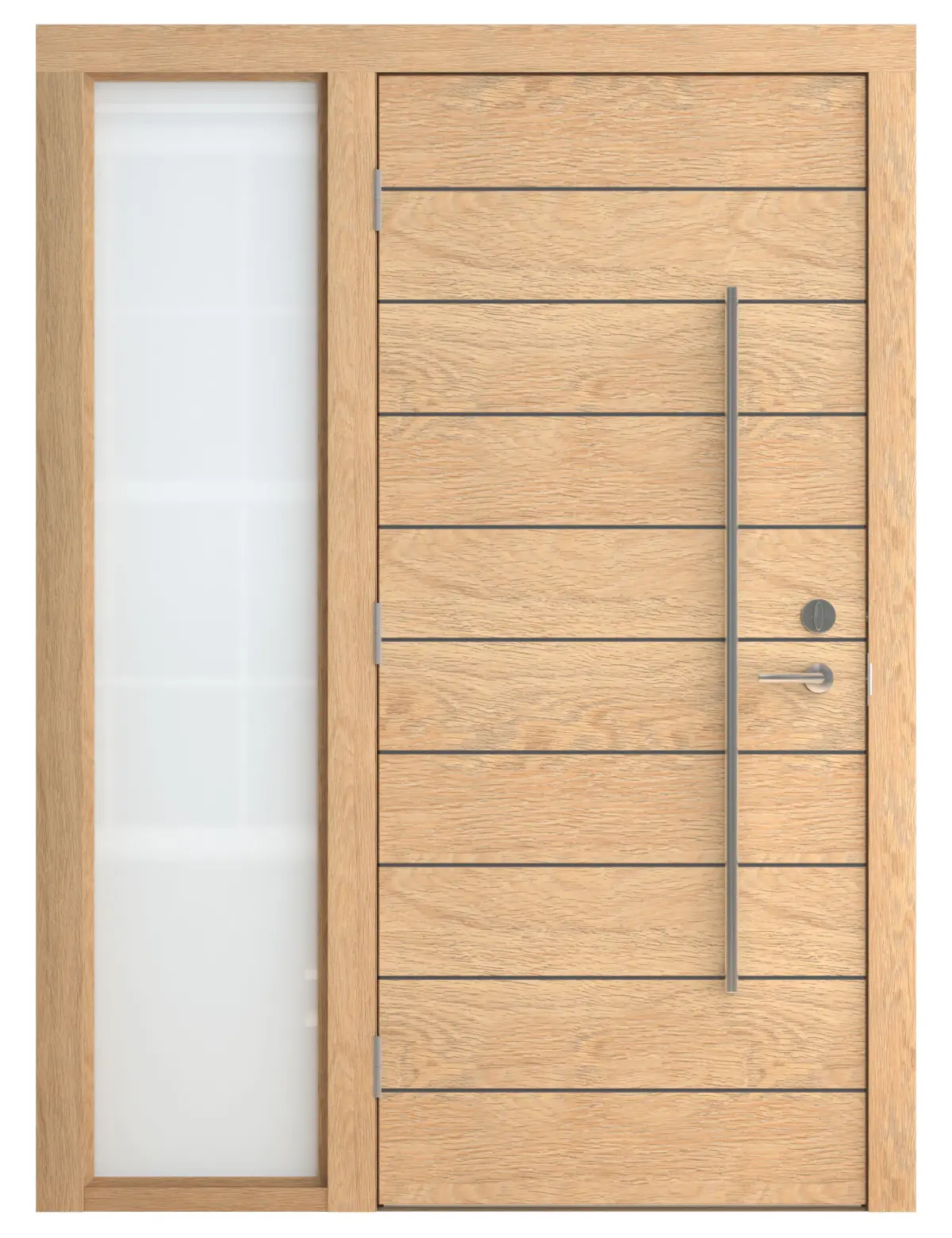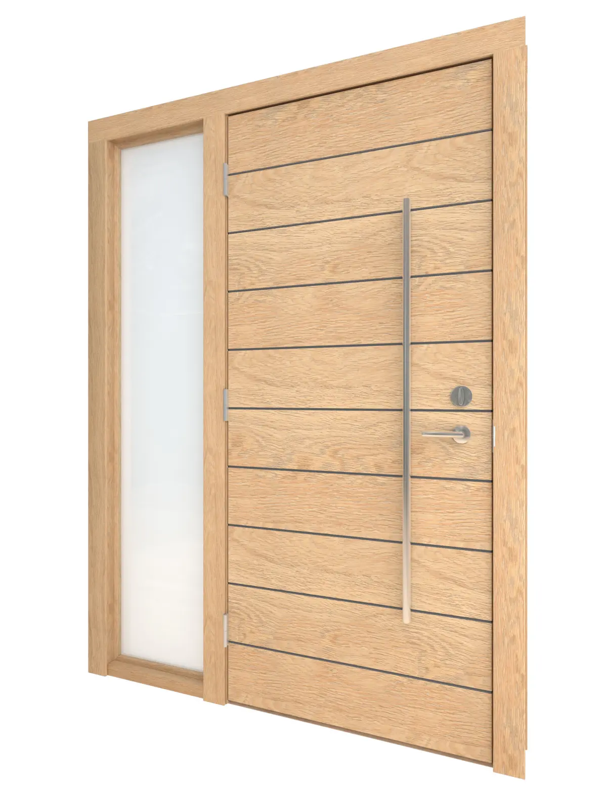 High Detail 3d Model of a modern Light Wood Door with Opaque Glass Lite on Right Side of Door. Door has Horizontal Detail Strips between panels, Large Aluminum Door Pull and other hardware included. Door wood grain can be seen.