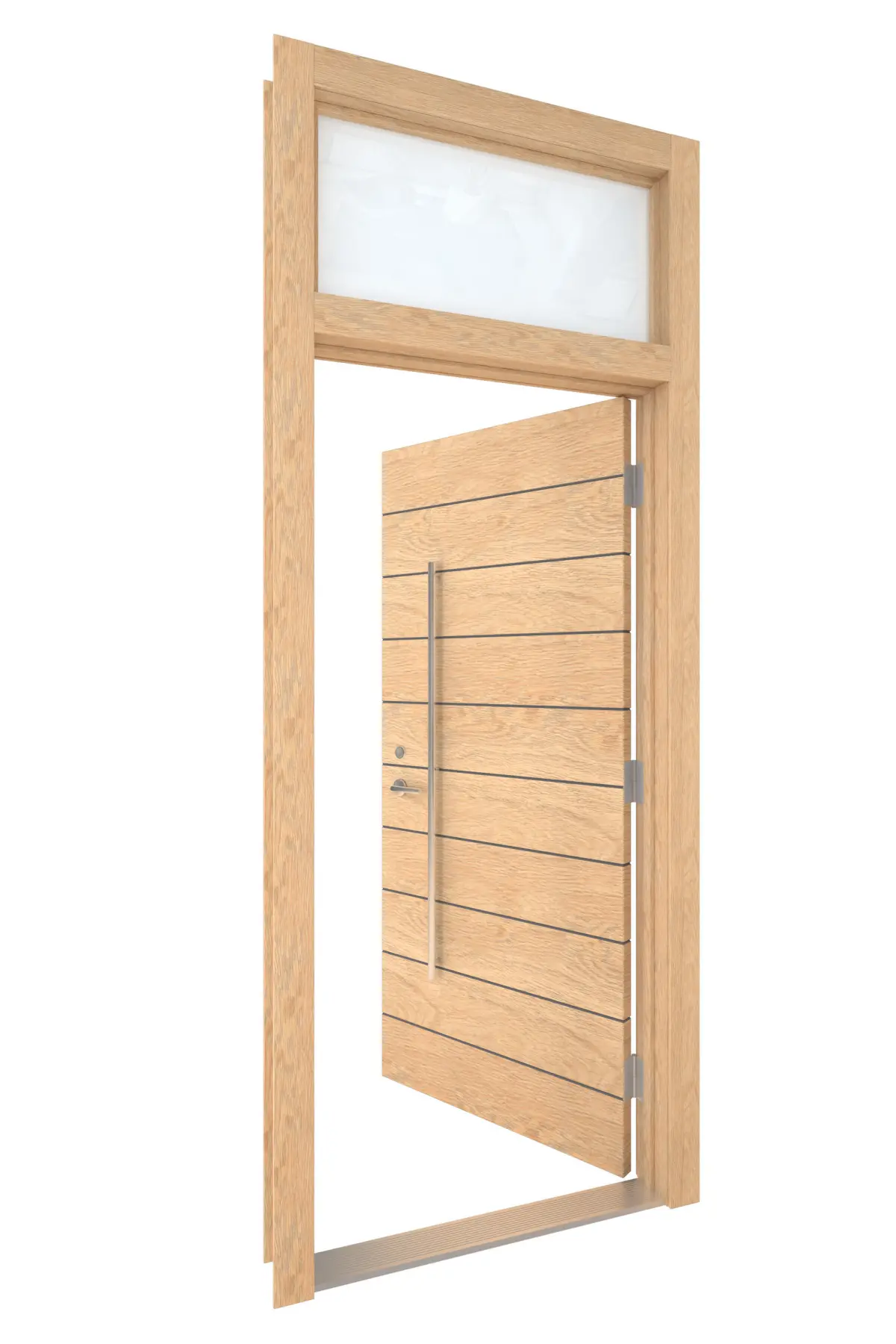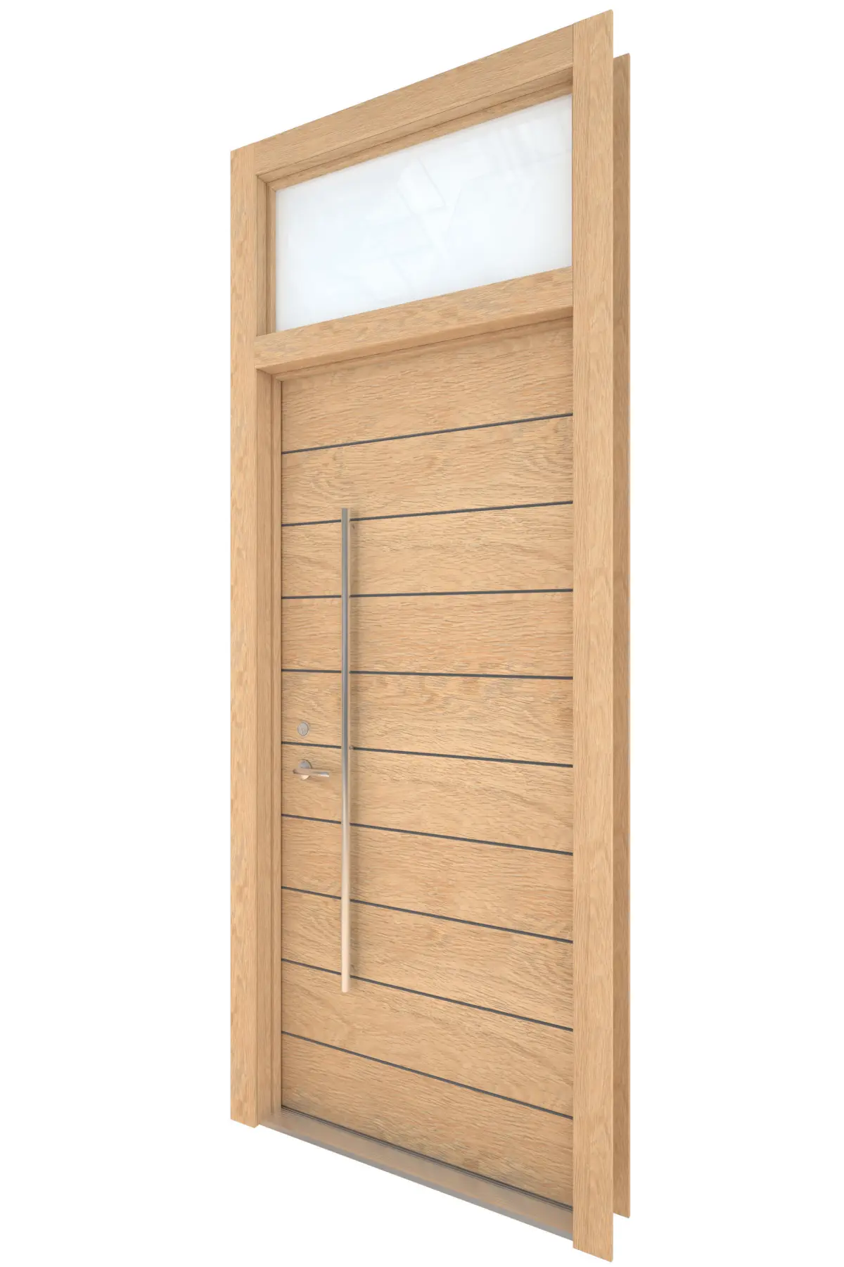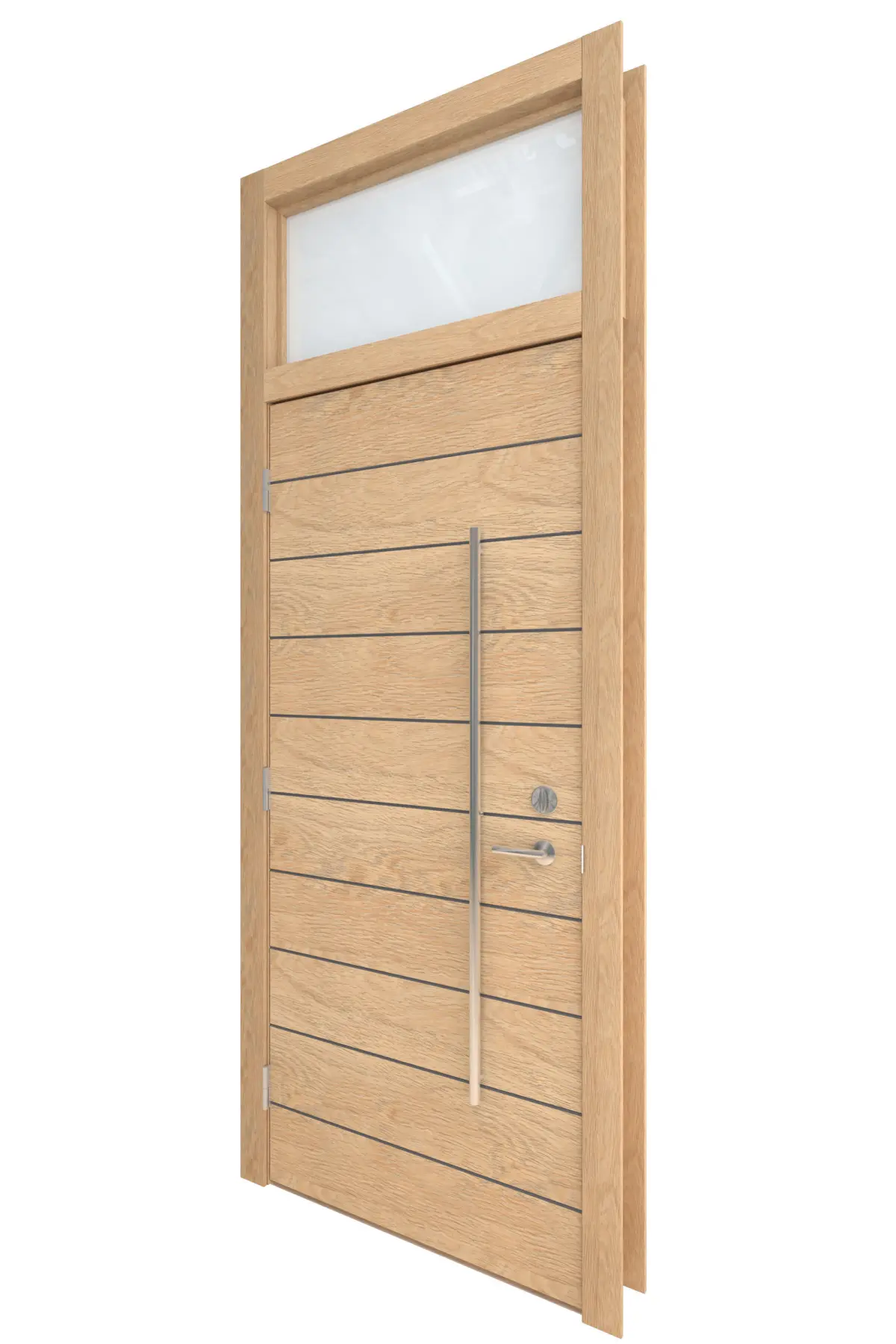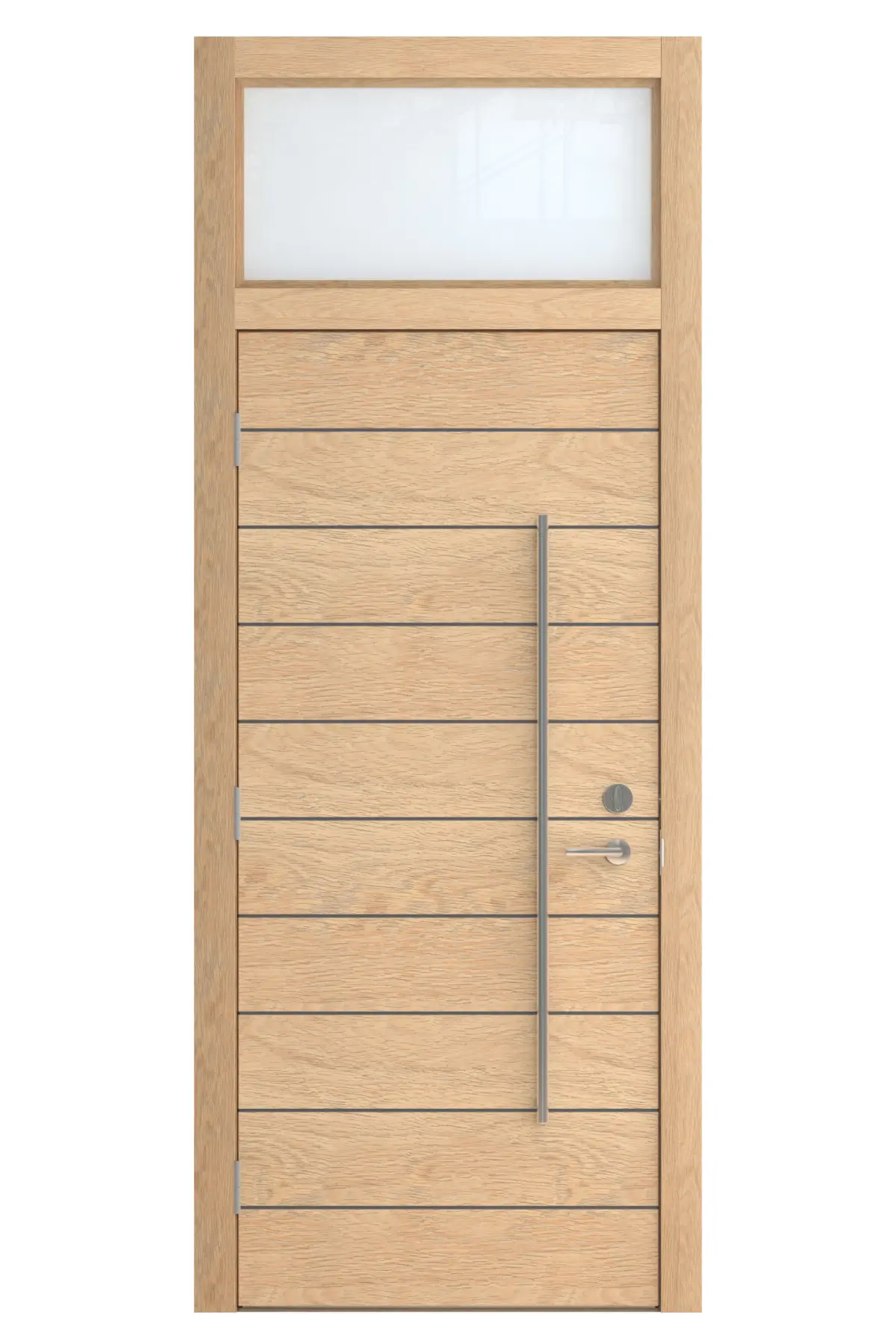 High Detail 3d Model of a modern Light Wood Door with Opaque Glass Transom Window Above. Door has Horizontal Detail Strips between panels, Large Aluminum Door Pull and other hardware included. Door wood grain can be seen.