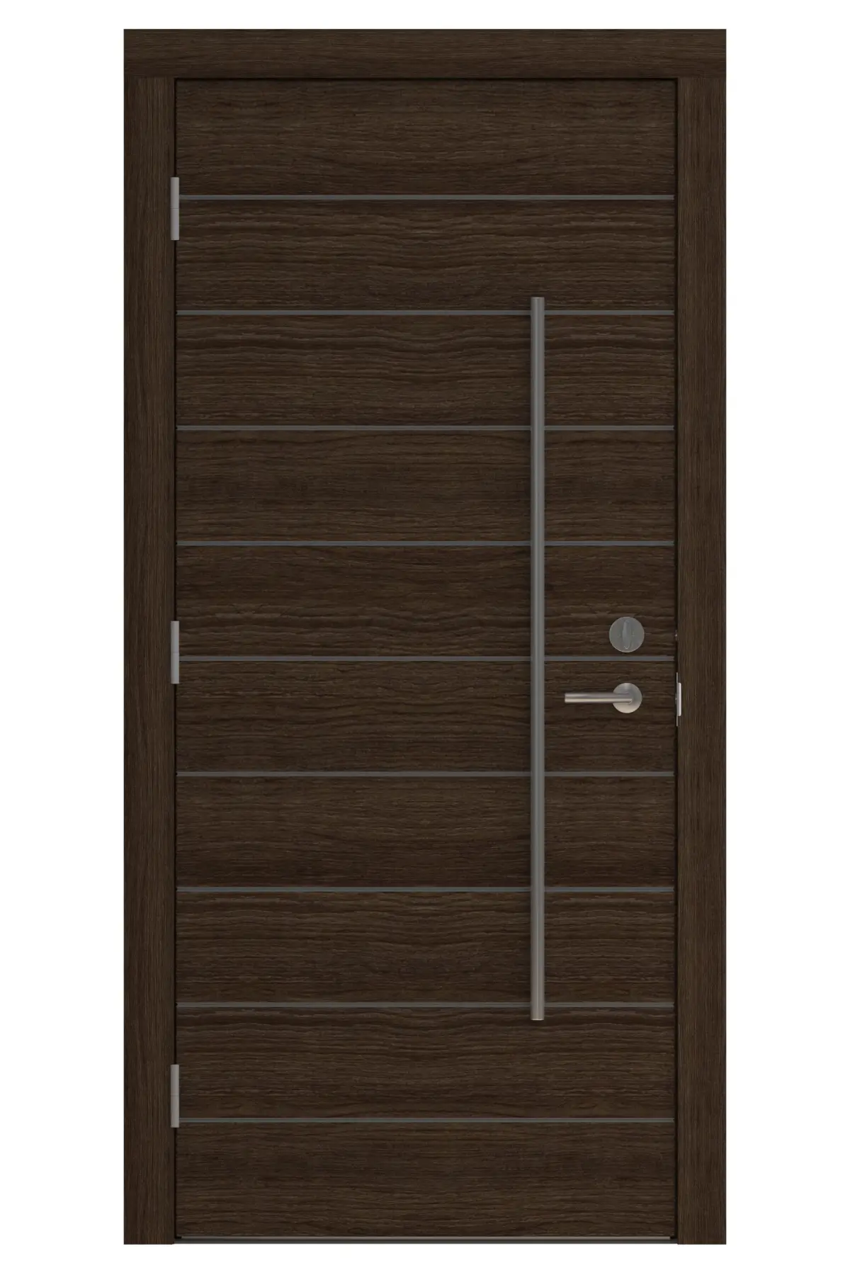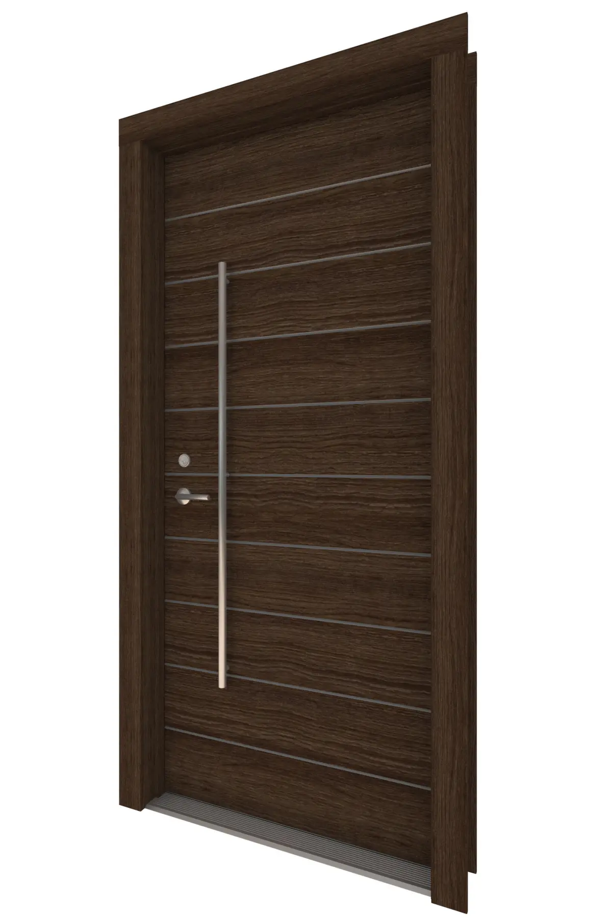 High Detail 3d Model of a modern Dark Wood Door. Door has Horizontal Detail Strips between panels, Large Aluminum Door Pull and other hardware included. Door wood grain can be seen.