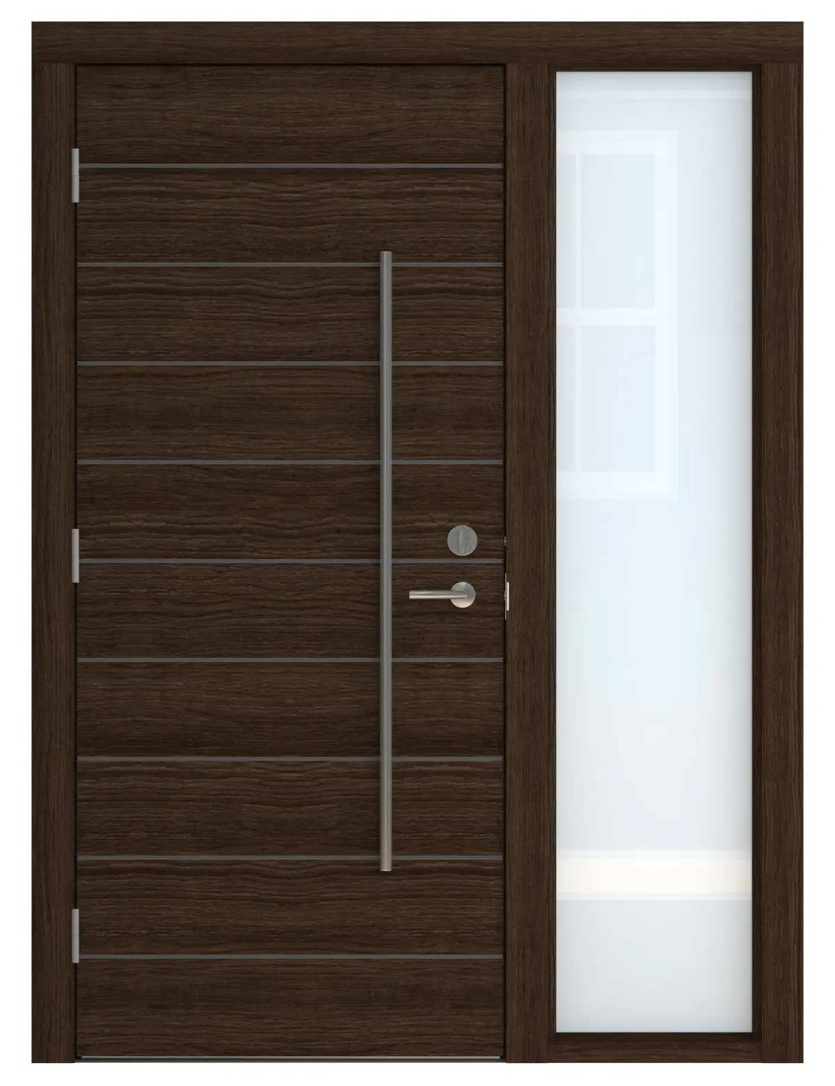 High Detail 3d Model of a modern Dark Wood Door with Opaque Glass Side Light on Left Side. Door has Horizontal Detail Strips between panels, Large Aluminum Door Pull and other hardware included. Door wood grain can be seen.