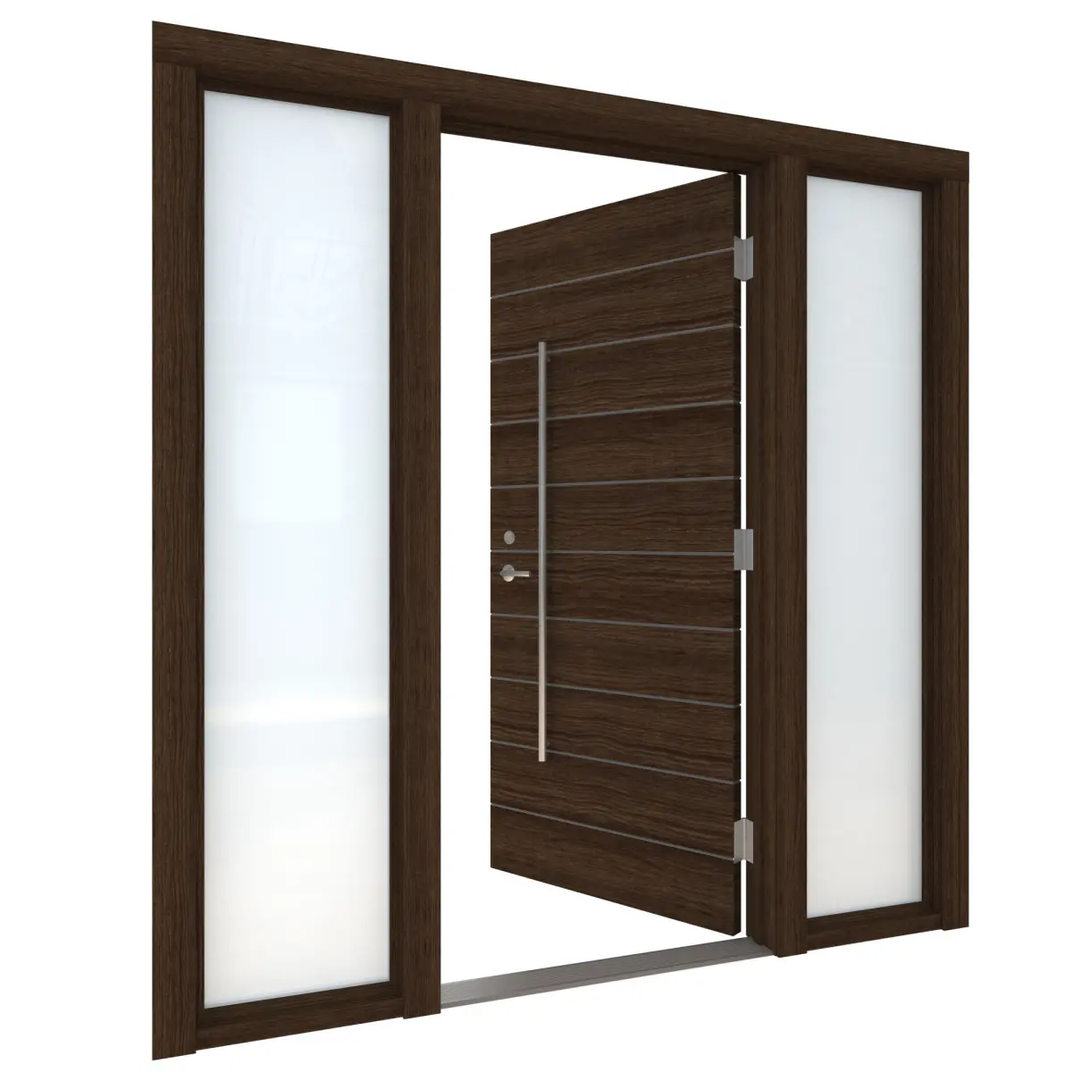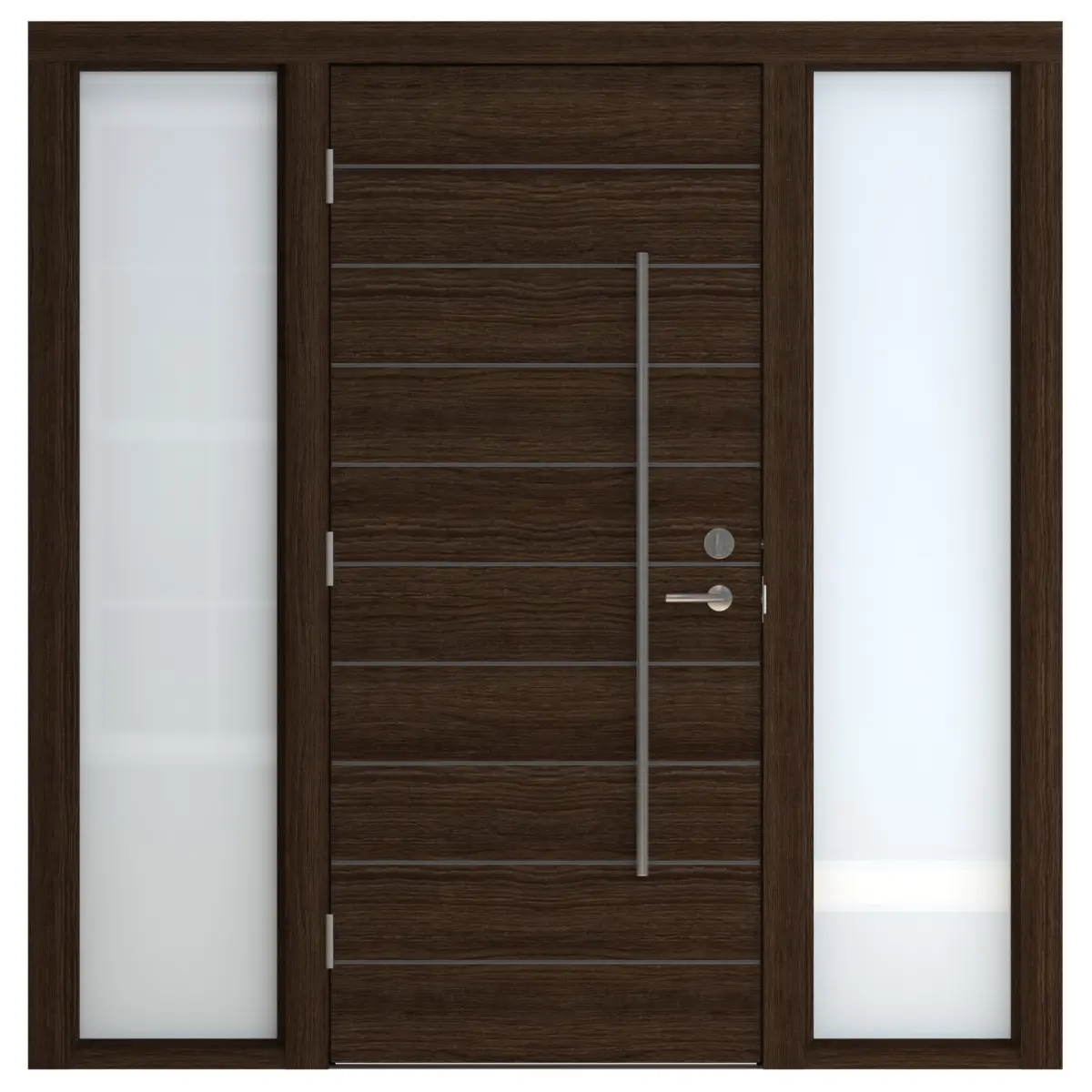 High Detail 3d Model of a modern Dark Wood Door with Opaque Glass Side Light on Left and Right Side. Door has Horizontal Detail Strips between panels, Large Aluminum Door Pull and other hardware included. Door wood grain can be seen.