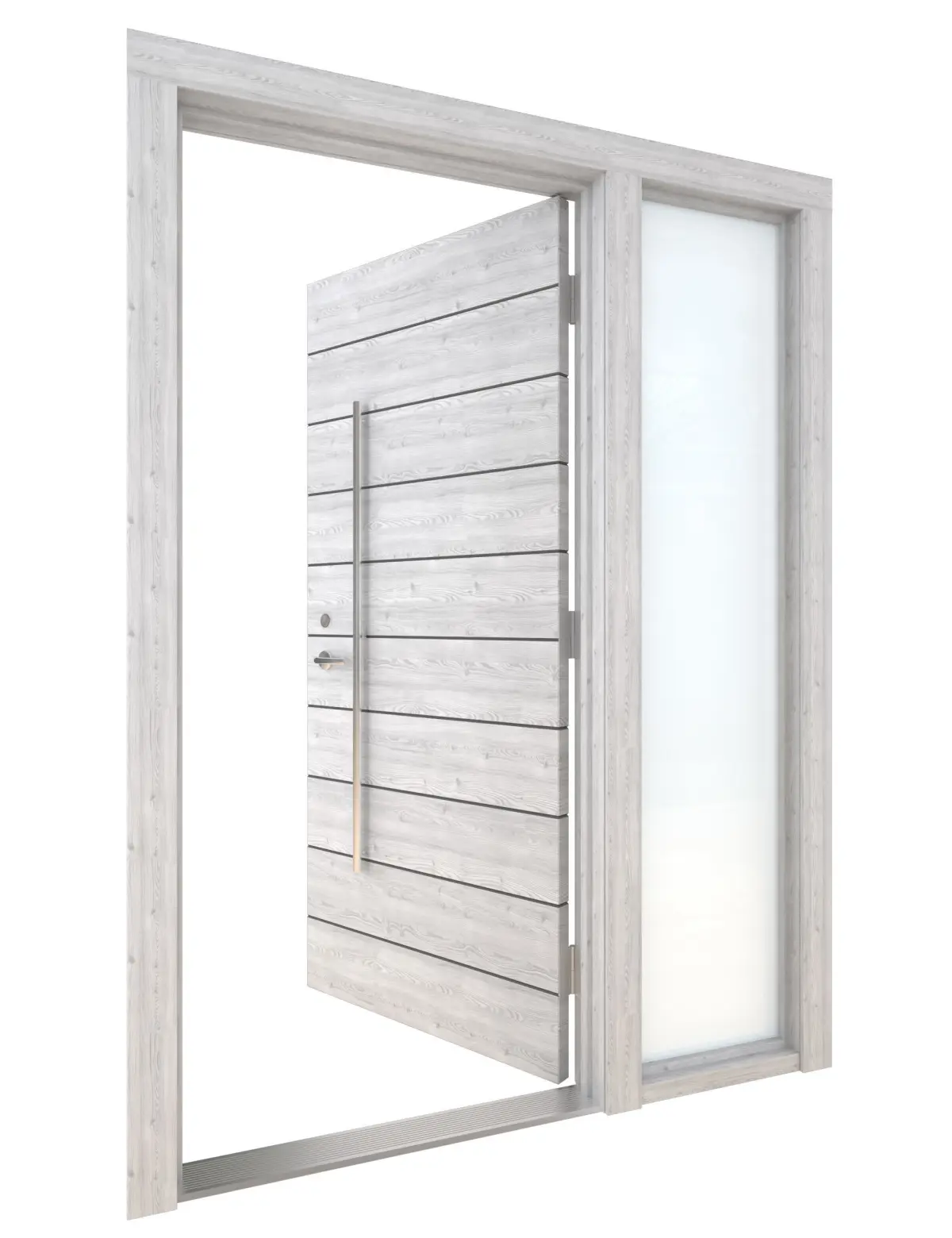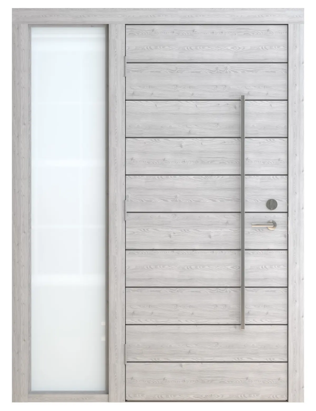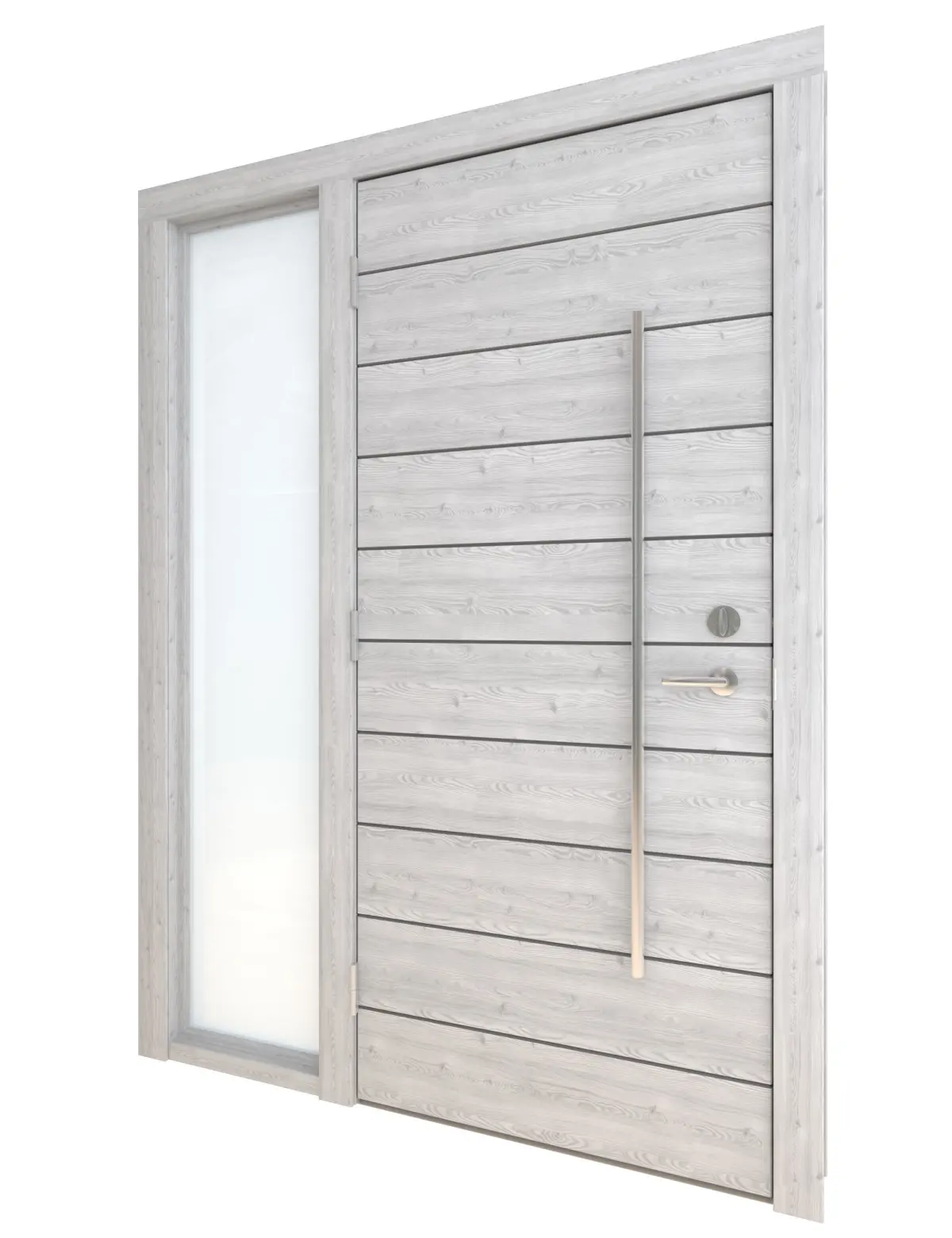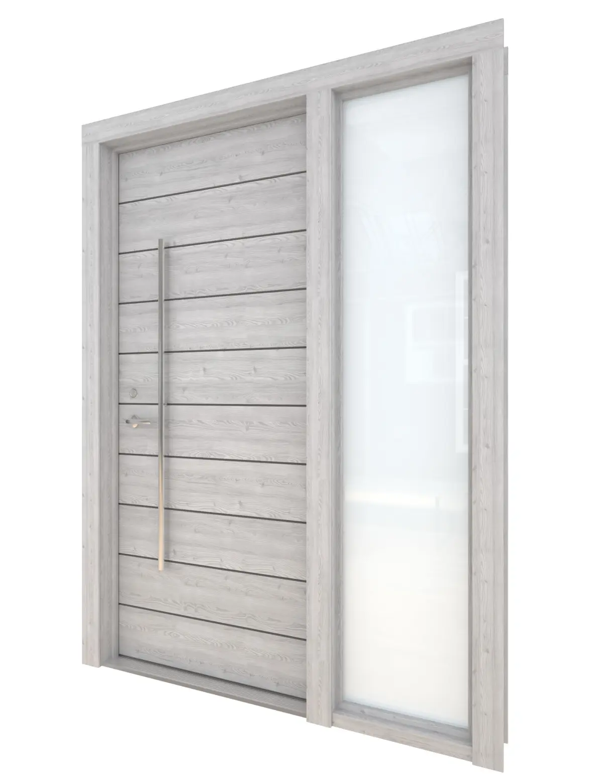 High Detail 3d Model of a modern Gray Wood Door with Opaque Glass Side Light on Right Side of Door. Door has Horizontal Detail Strips between panels, Large Aluminum Door Pull and other hardware included.