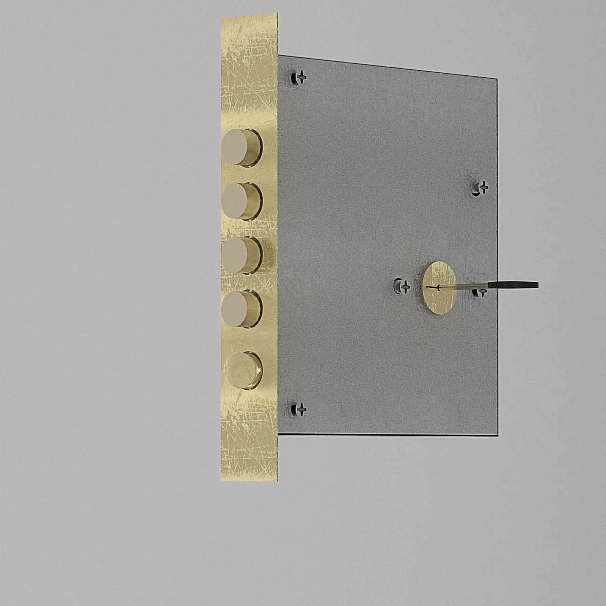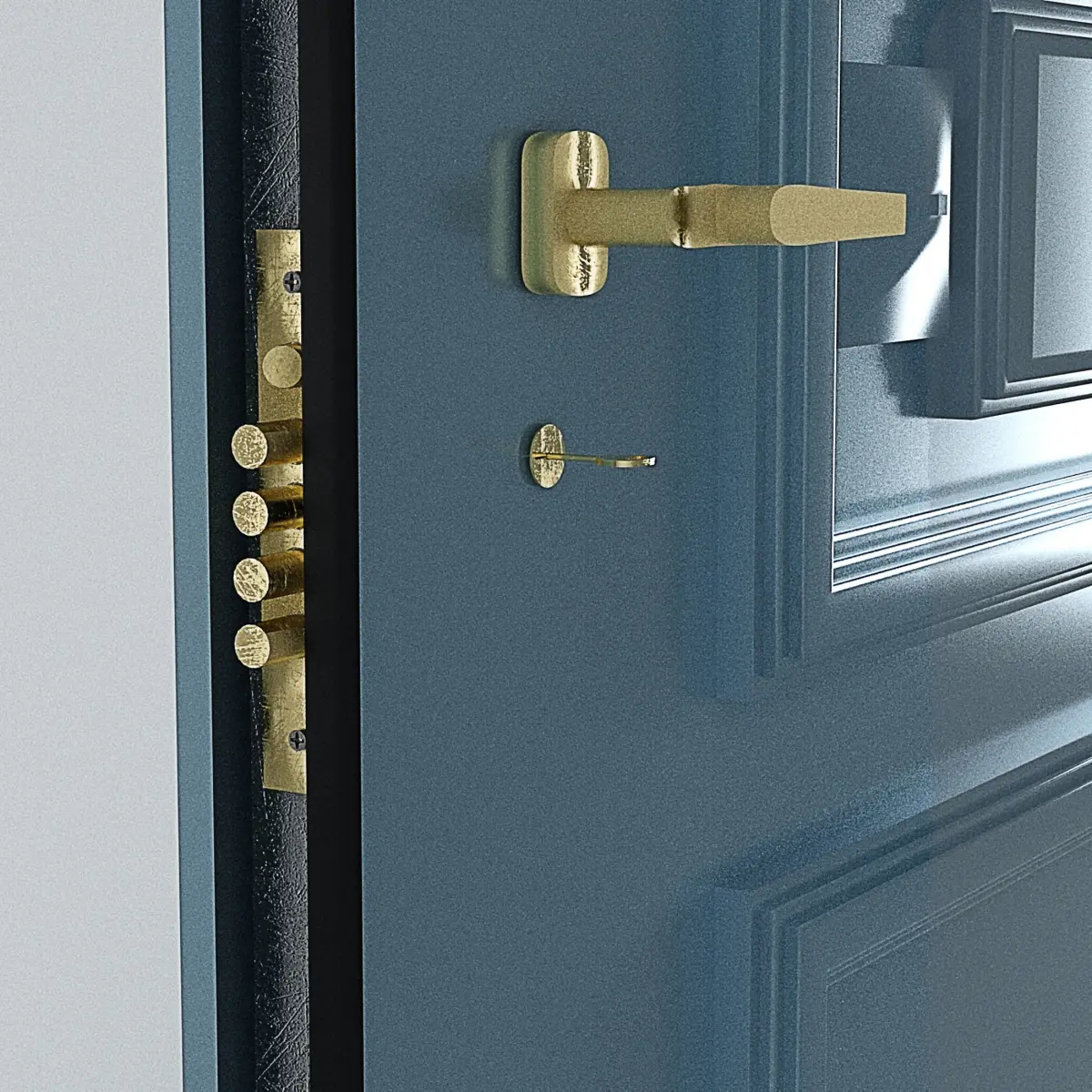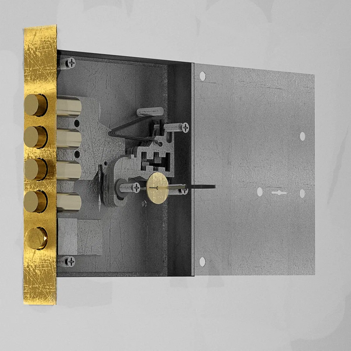 Door lock, disassembled.2 gold paint handles and a door. 3d set.