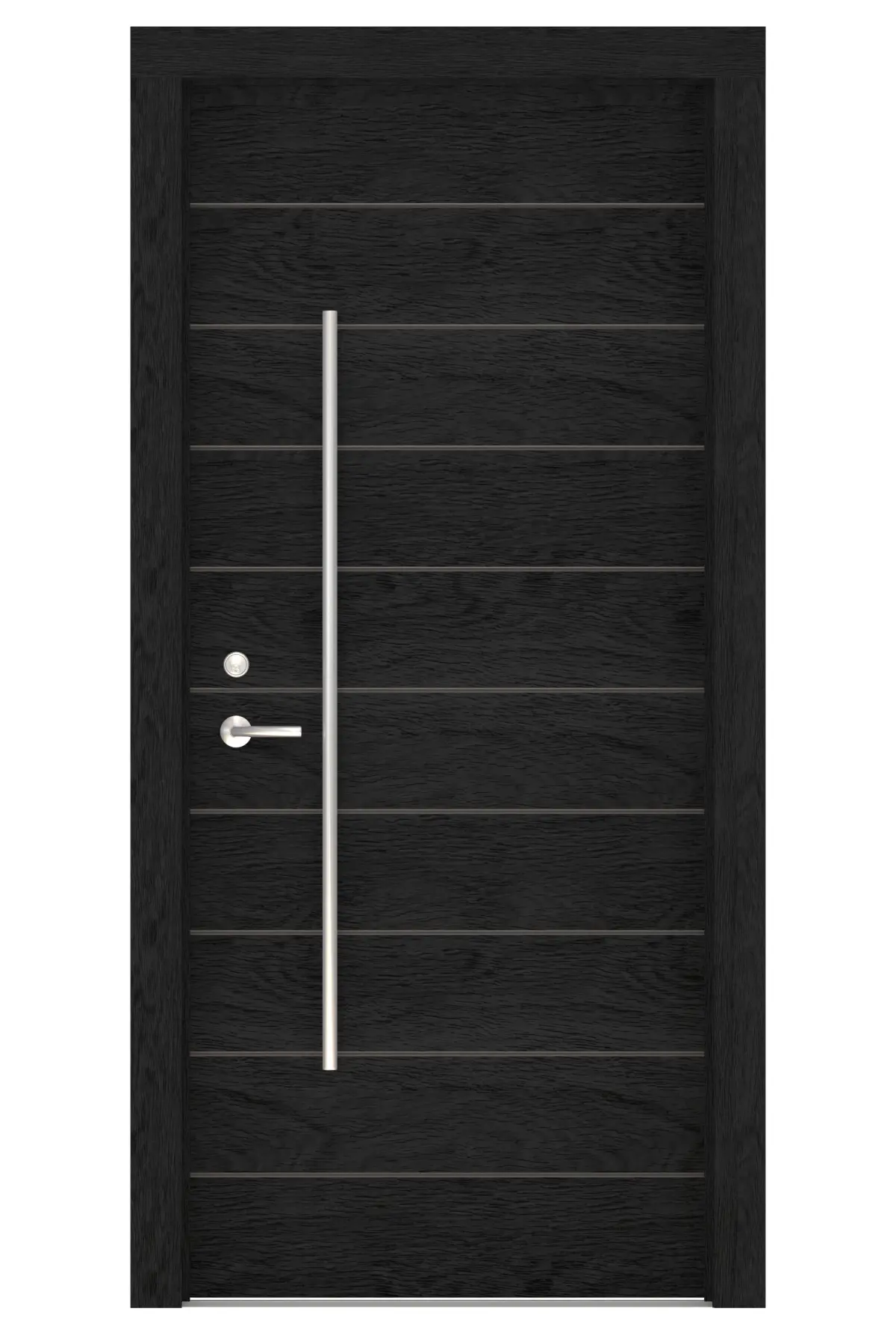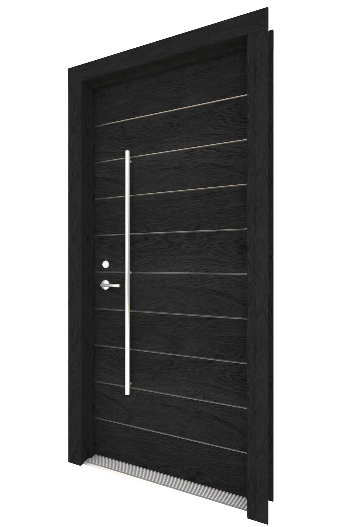 Door has Aluminum Horizontal Detail Strips, Large Aluminum Door Pull and other hardware included. Door wood grain can be seen.