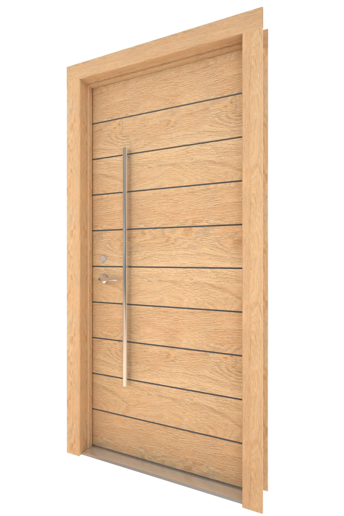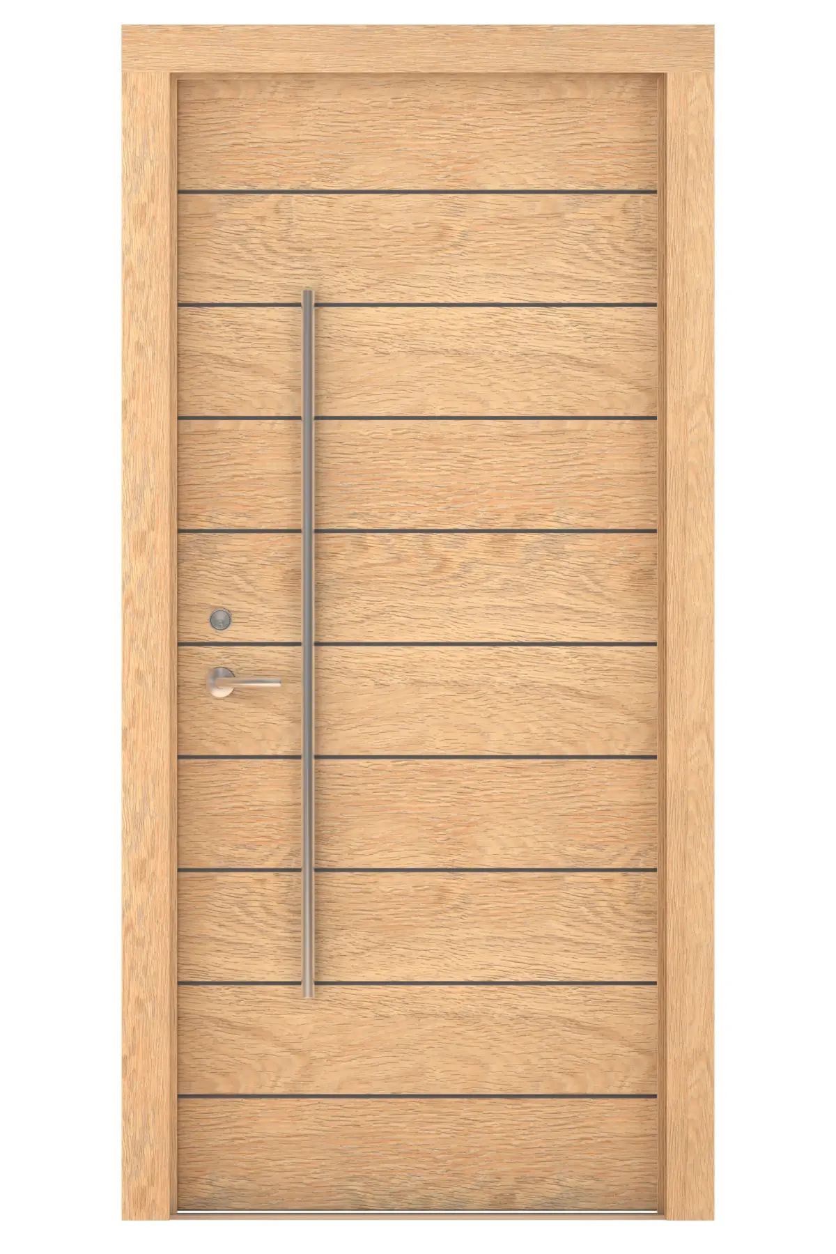 Door has Aluminum Horizontal Detail Strips, Large Aluminum Door Pull and other hardware included. Door wood grain can be seen.