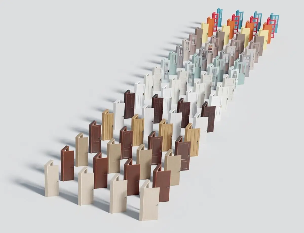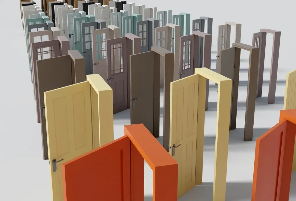 A large collection of 80 highly realistic interior door 3D models with door frames included. Rotation constraints have been applied to each door, allowing for easy, and natural door opening and closing. The constraints are added in Blender and may not translate to other applications. You can easily swap and change the materials for the doors, door frames and door handles in Blender. Each model is complete with hinges, latches, latch recesses and screws for extra realism.