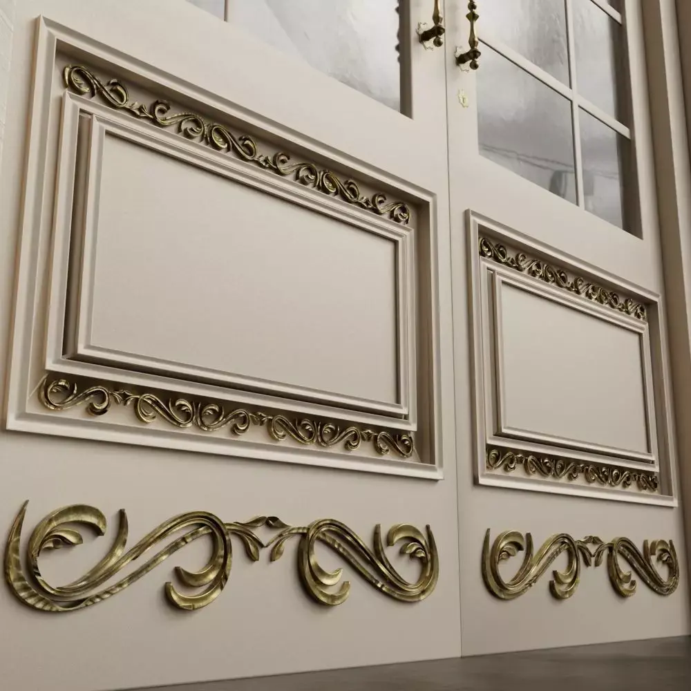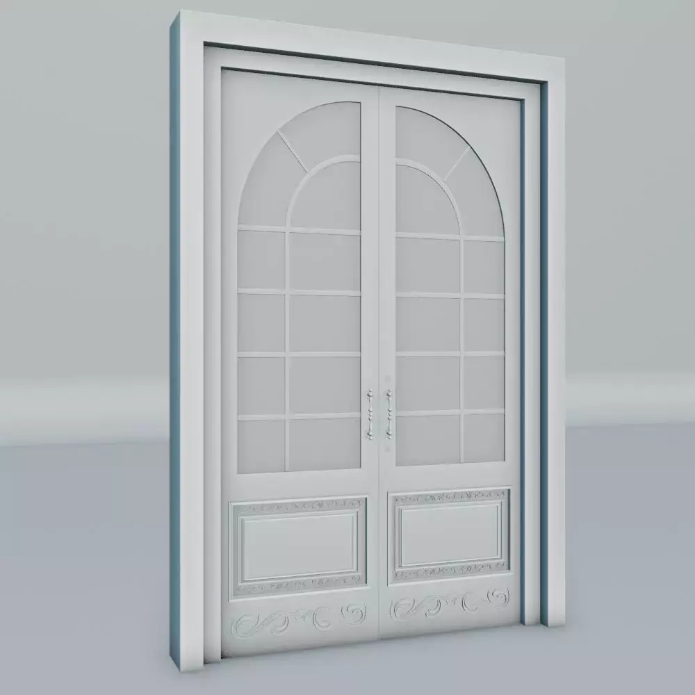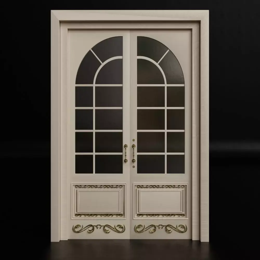 A 3D model Door Design 1 of a classic, elegant, double-leaf door, designed with luxurious decorative details. This door features a combination of wood and a large, curved glass panel at the top, creating a classic yet modern feel. Each door leaf is adorned with gold-carved ornaments at the bottom, along with an antique-designed door handle.