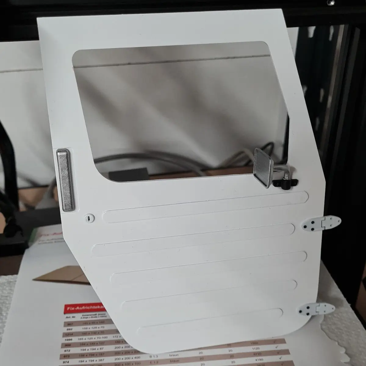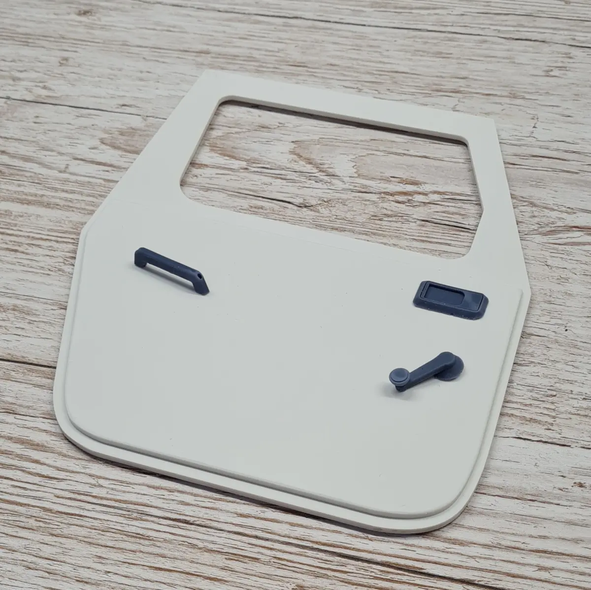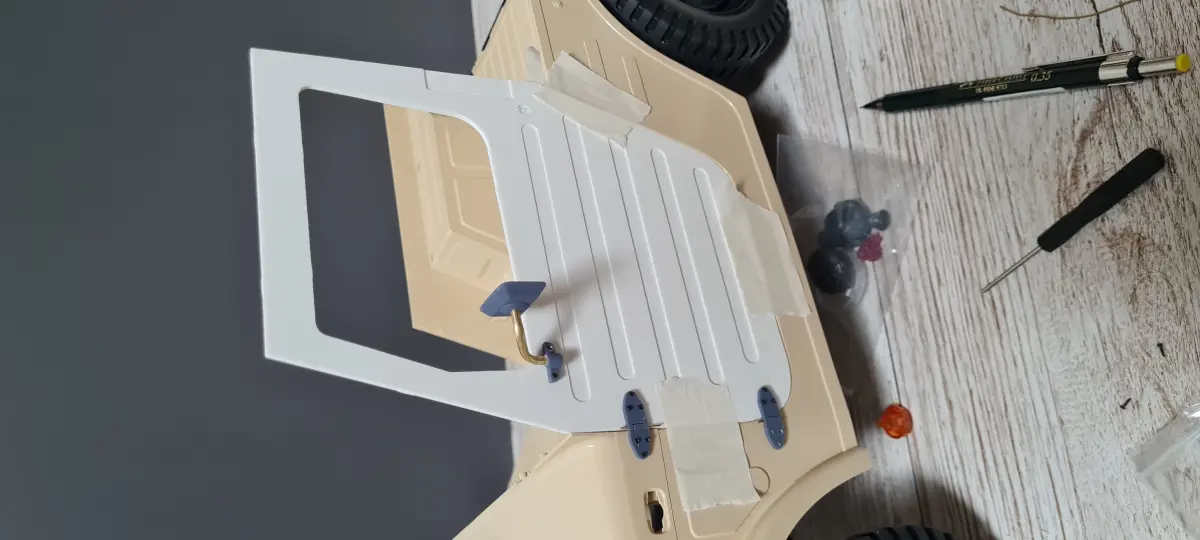 Attachment parts:keyholedoor handle outsidedoor handle insidehand crank windowmirrormirror holderSpiegelroht (I used a 3mm copper pipe)door attachmentsLateral attachments for bodyworkHinges (0.8mm hole for rotation)doordoor inside