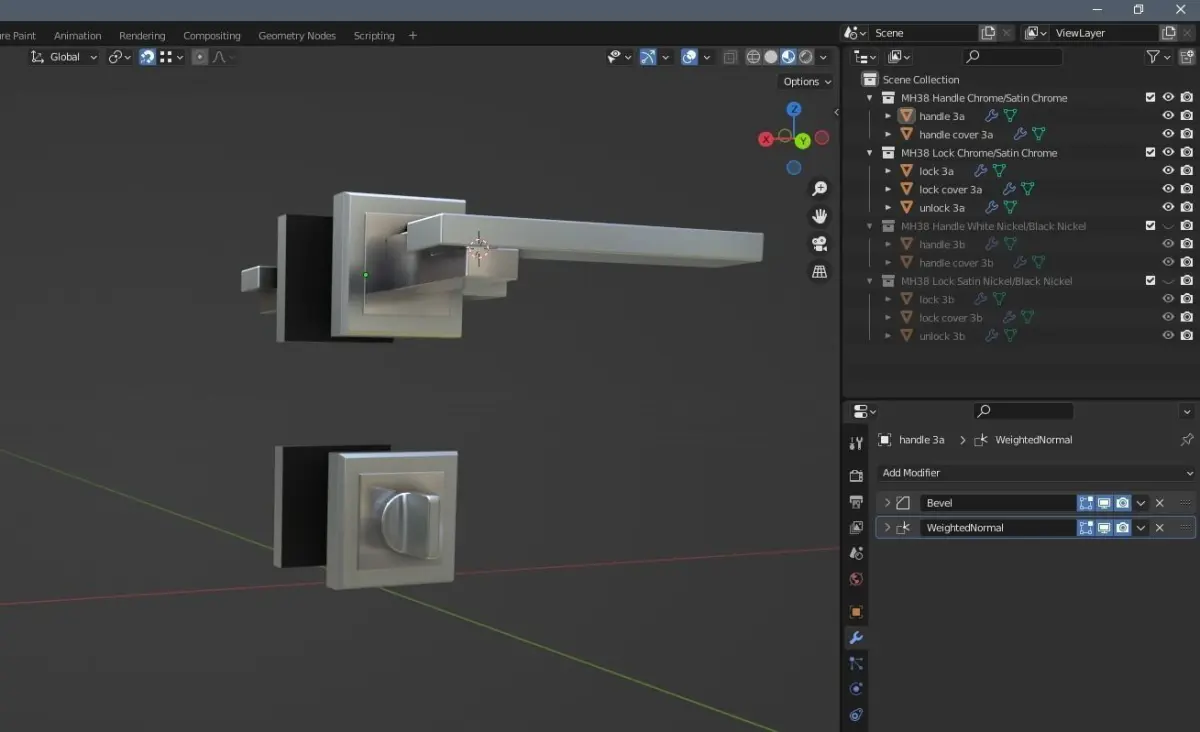 Perfect for your next ArchViz or Interior Design project. Handles come pre-spaced for doors 40mm thickness. Privacy locks are included for an optional configuration.