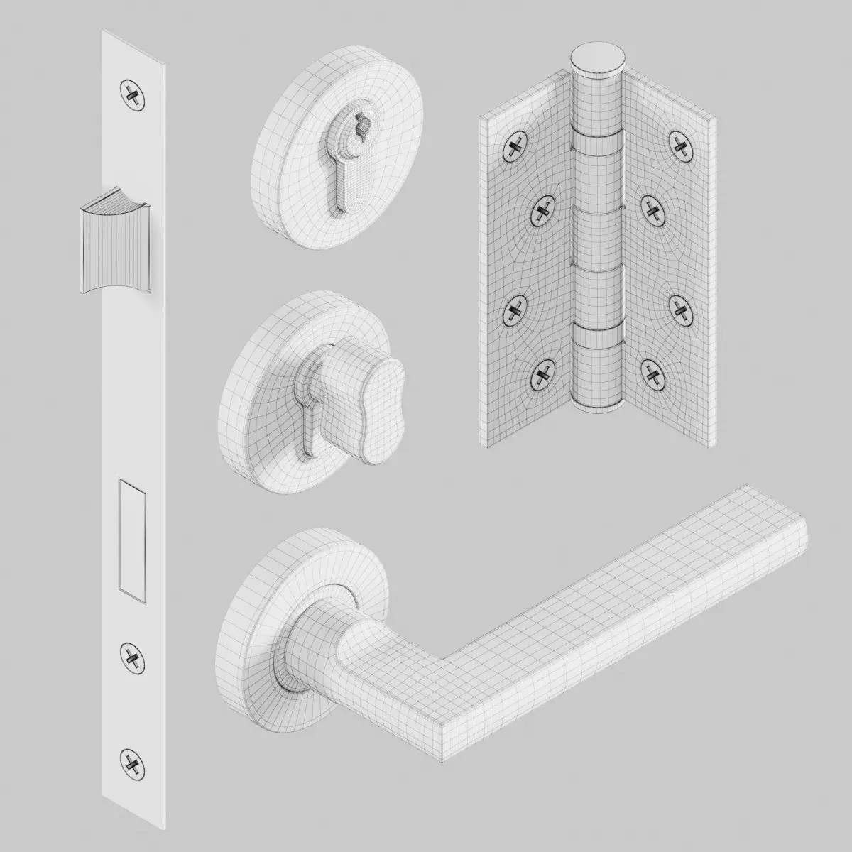 Model of mock up door set complete with Handle, Hinge, mortise lock, and lock.Brushed Metal finish only use 3dsmax native noise map, no textures included.All models have proper uv map and turbosmooth open.